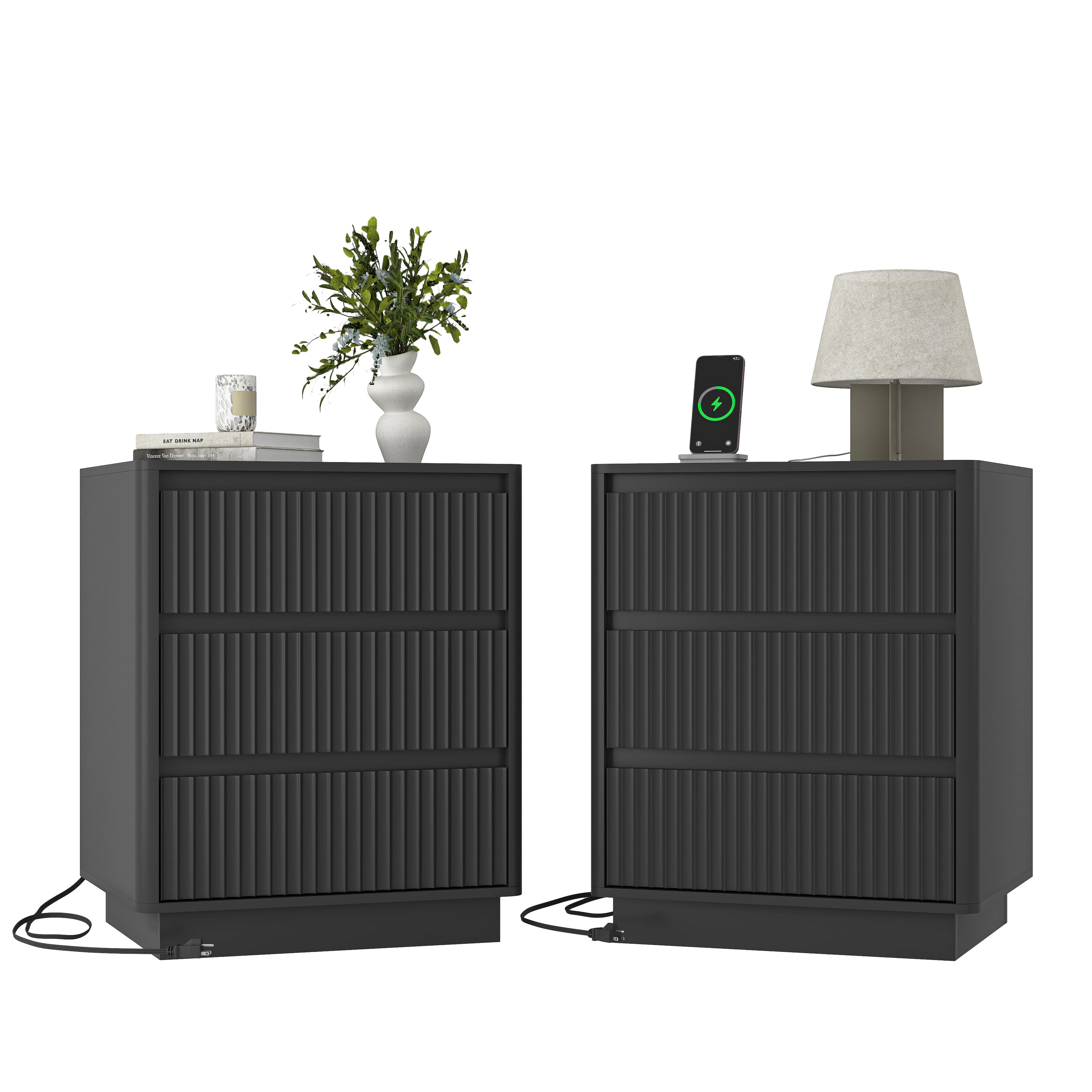 Set Of 2 End Table With Fast USB C Charging Station, Sofa Side Table With 3Drawers, Large Storage Modern Wood Storage Cabinet For Living Room,Bedroom,Office, Black