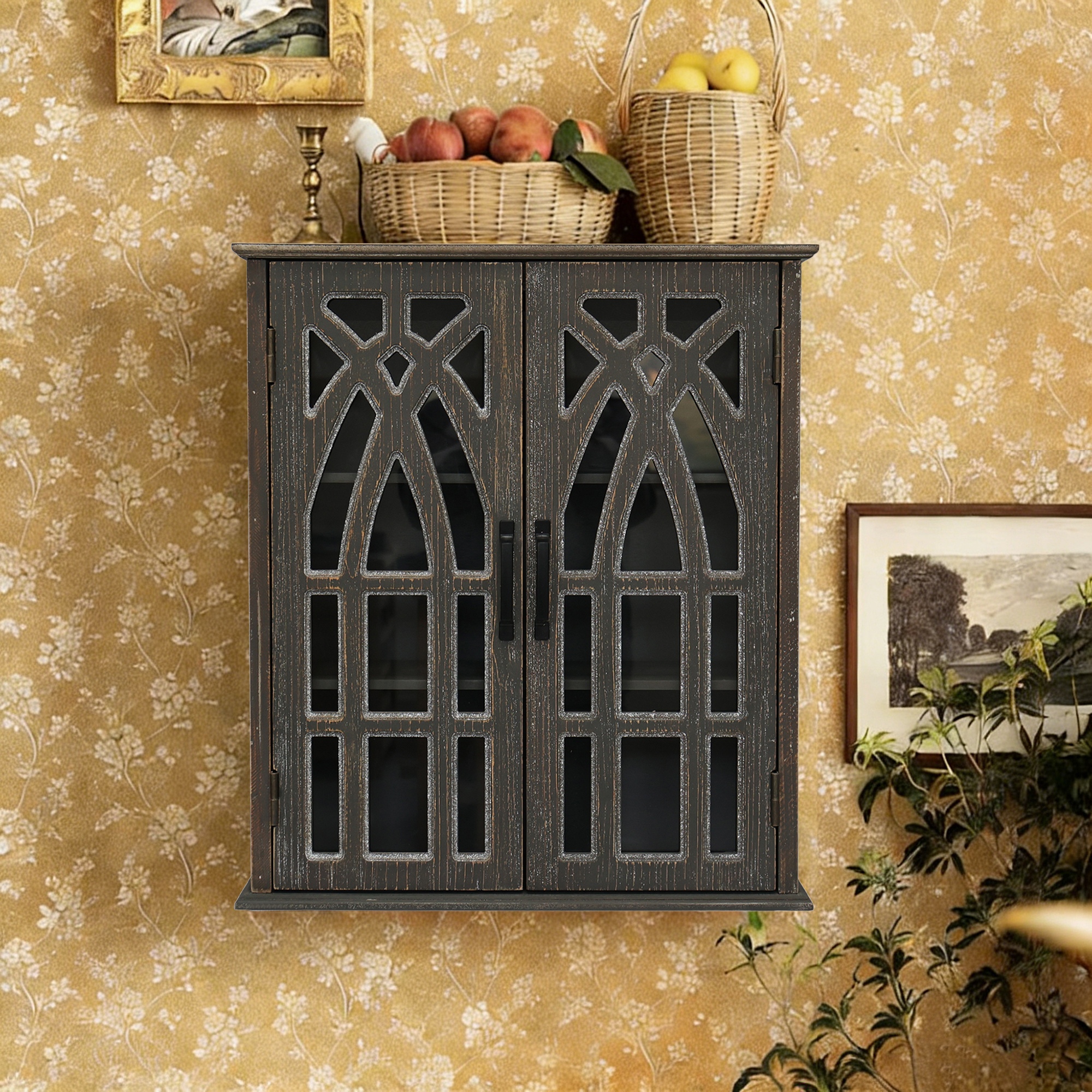Vintage Wall-Mounted Cabinet With Decorative Cutout Doors, Rustic Wooden Hanging Storage Cabinet For Bathroom, Living Room, Bedroom, Farmhouse Style Antique Black