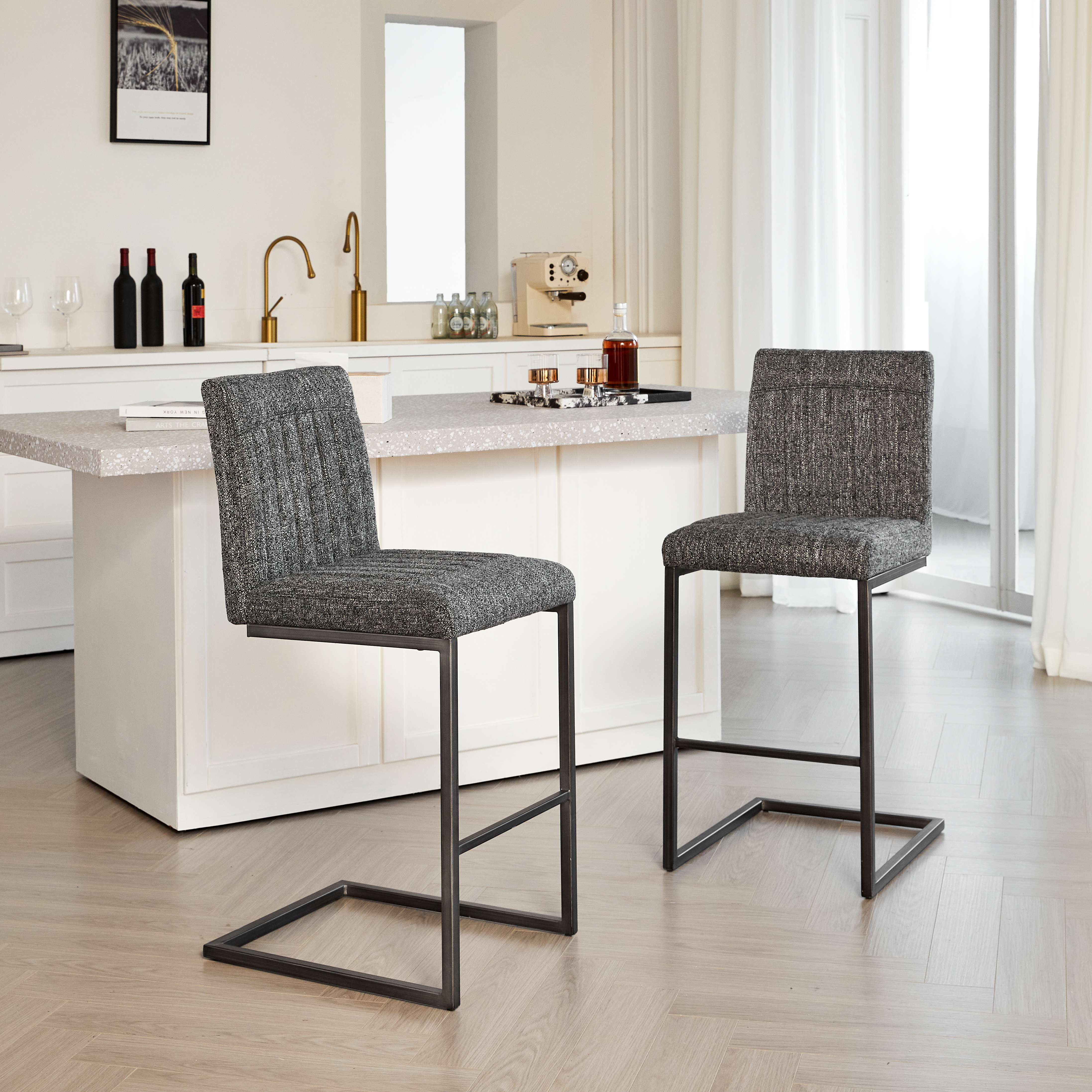 Bar Stool - Speckled Gray Textured Fabric With Vertical Tufted Backrest Sturdy Black Metal Frame & Footrest For Kitchen Island & Home Bar 2 Sets
