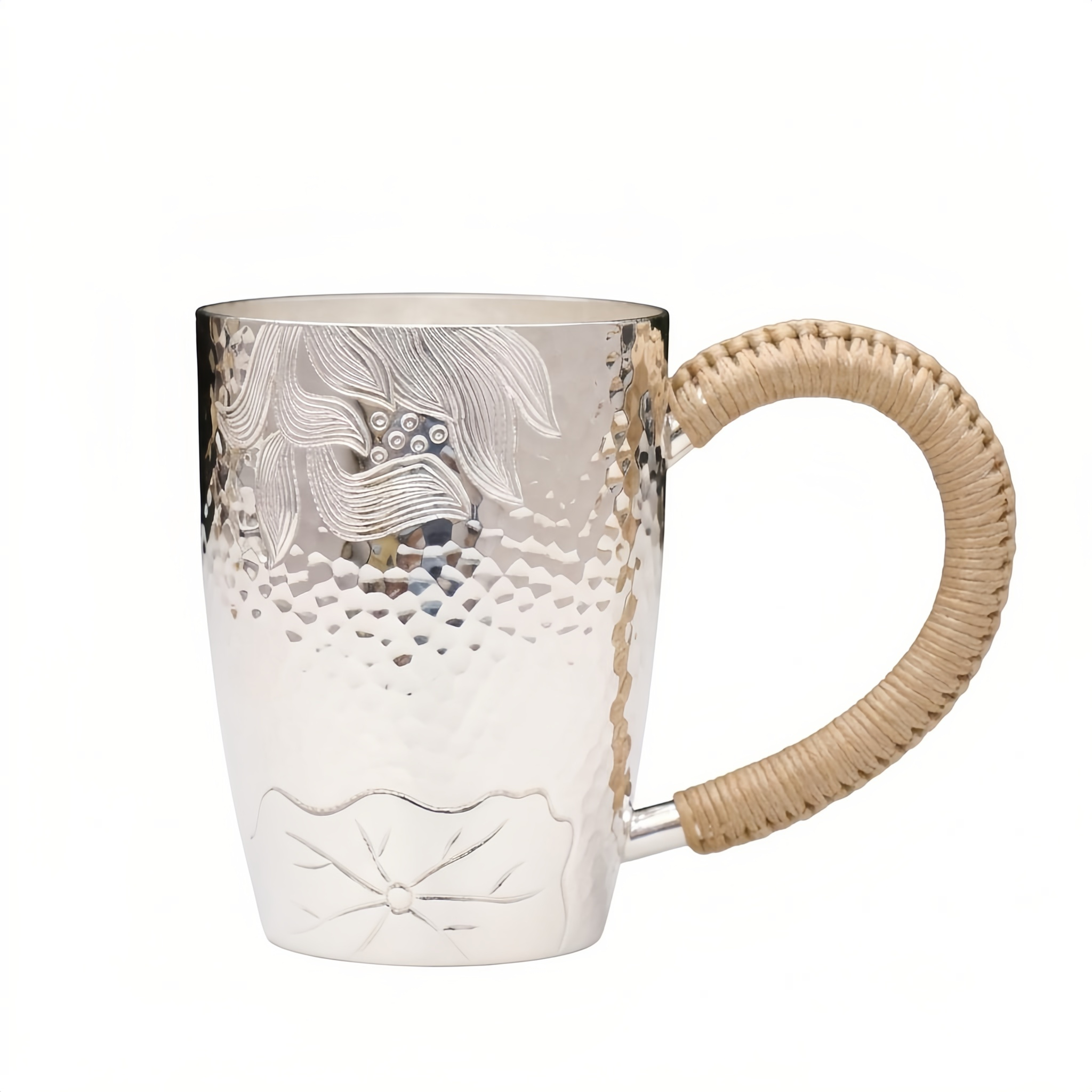 925 Sterling Silver Artisanal Hammered Silver Mug with Woven Rattan Handle and Floral Motifs - Handicraft