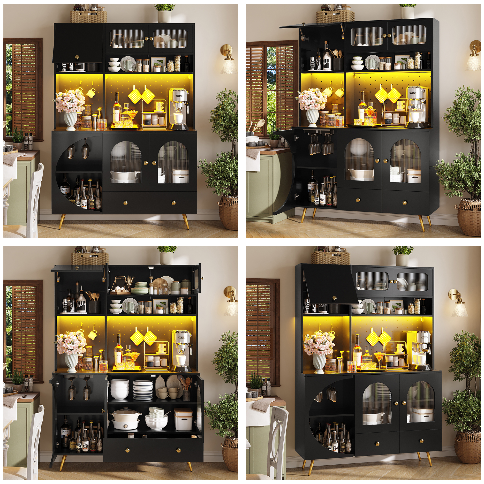 Tall Kitchen Cabinet With LED Lights & USB Ports, Modern Sideboard Storage Cabinet With Power Outlets, Perforated Wall, Drawer & Glass Shelves, For Kitchen & Living Room, 120x40x176 Cm, Black