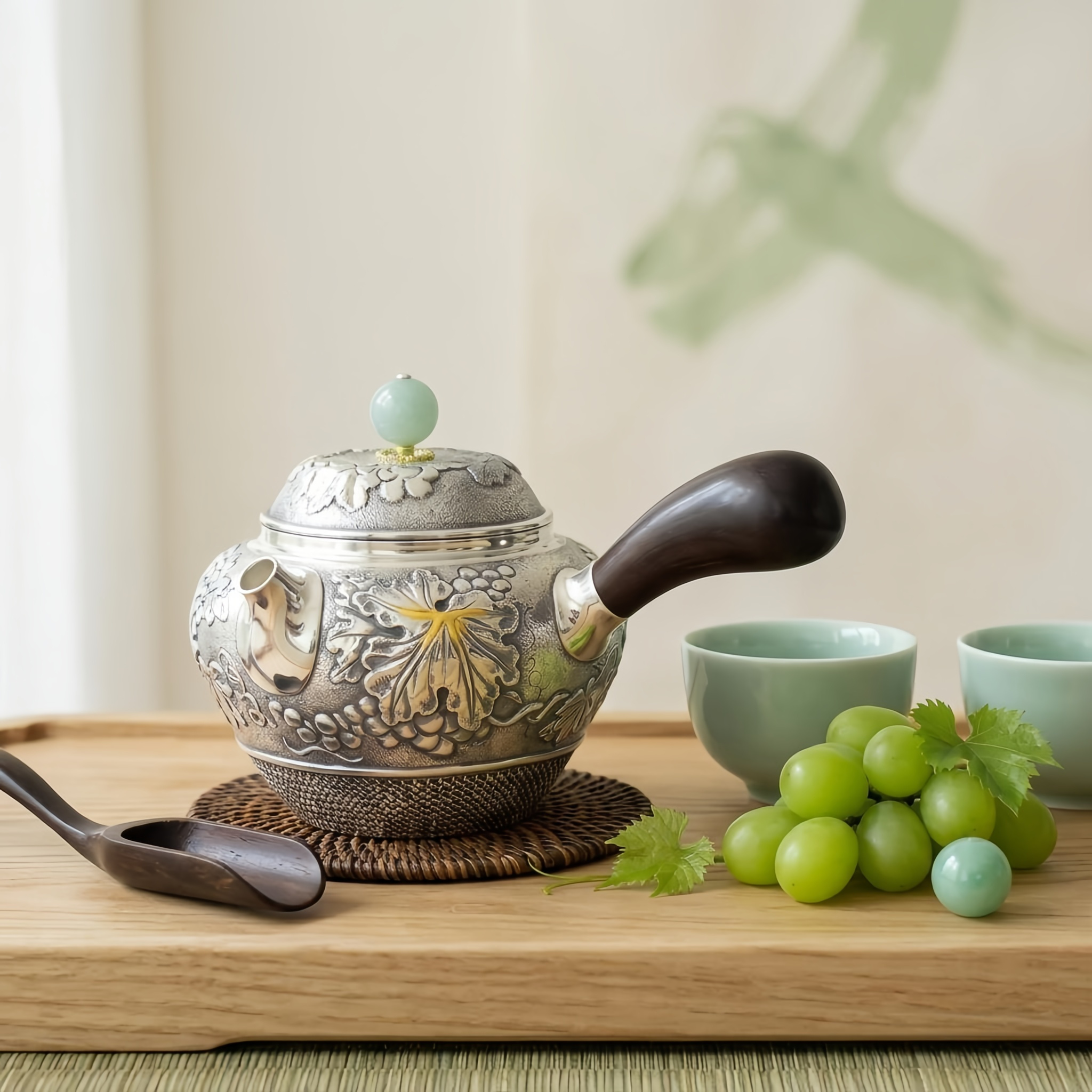 925 Sterling Silver Artisanal Silver Teapot Featuring Intricate Grape Motifs and Polished Jade Finial - Handicraft