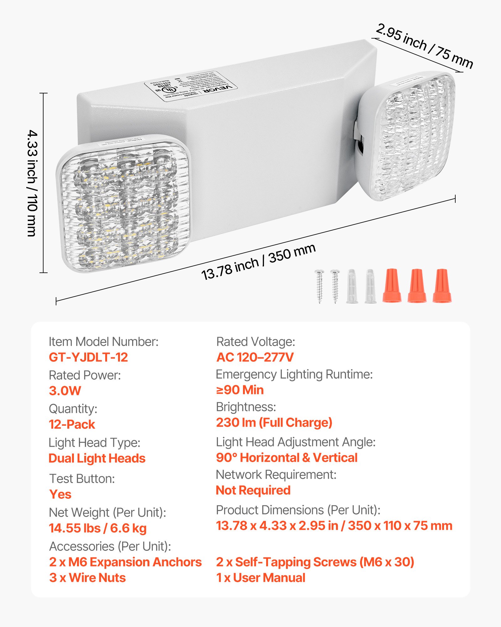 12 Pack Emergency Lights For Business, With Battery Backup, Commercial LED Emergency Exit Lighting Fixtures, AC 120/277V, With Two Square Head Adjustable, 90-Minute Backup, For Business, White