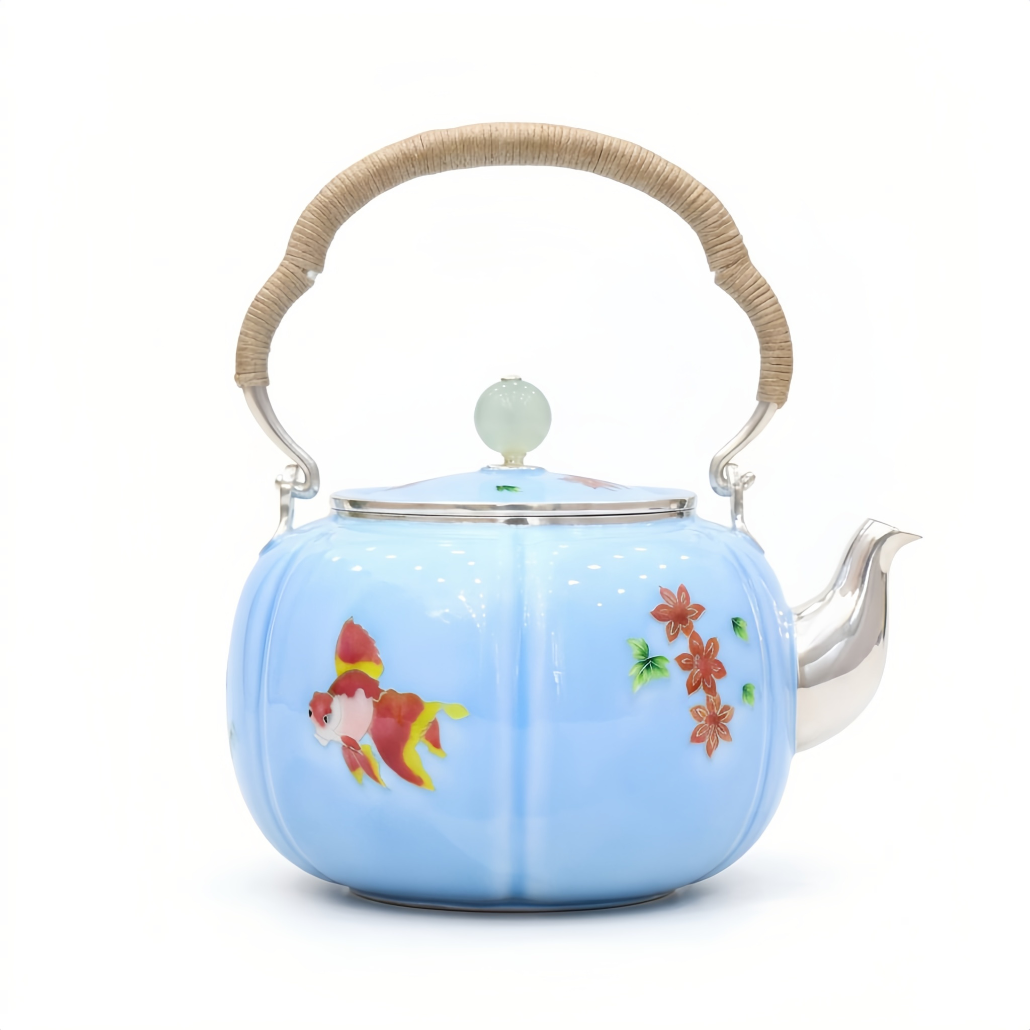 925 Sterling Silver Elegant Light Blue Ribbed Teapot with Painted Fish and Floral Accents - Handicraft