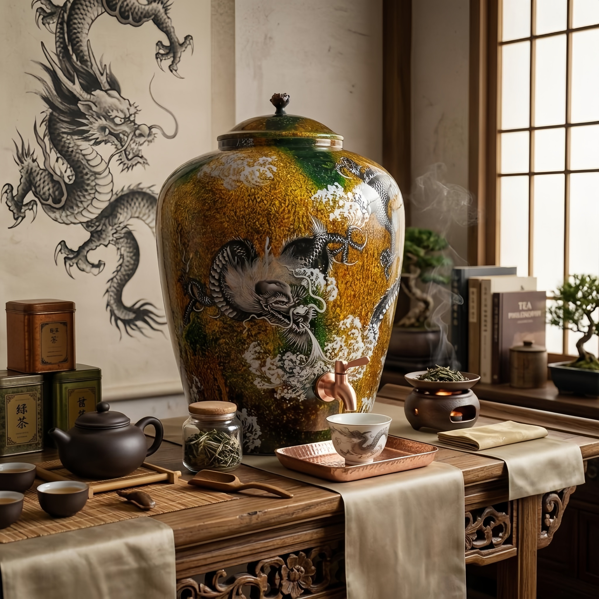 925 Sterling Silver Hand-Crafted Ceramic Dragon Beverage Jar with Polished Metallic Spigot and Decorative Lid - Handicraft