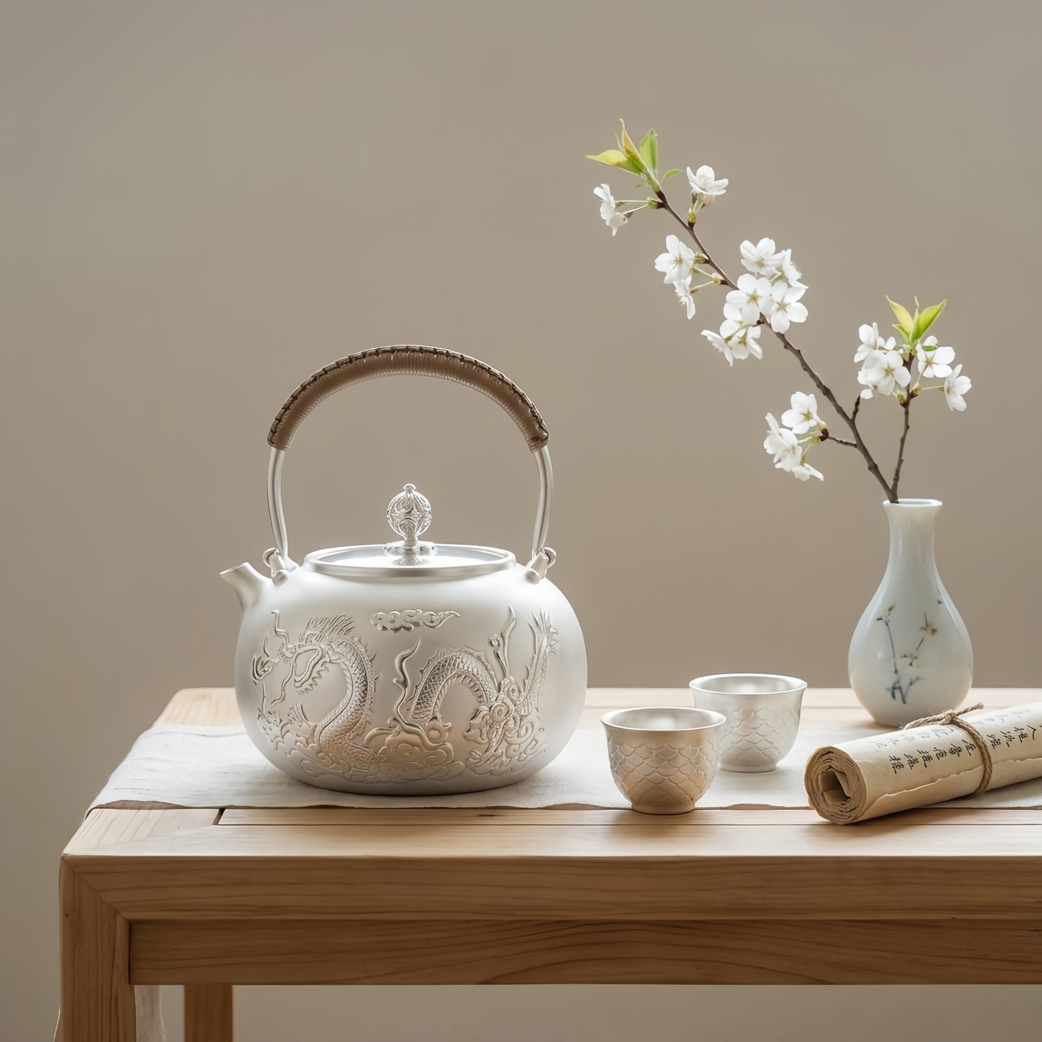 925 Sterling Silver Exquisite Silver Teapot with Hand-Embossed Dragon Motif and Woven Handle - Handicraft