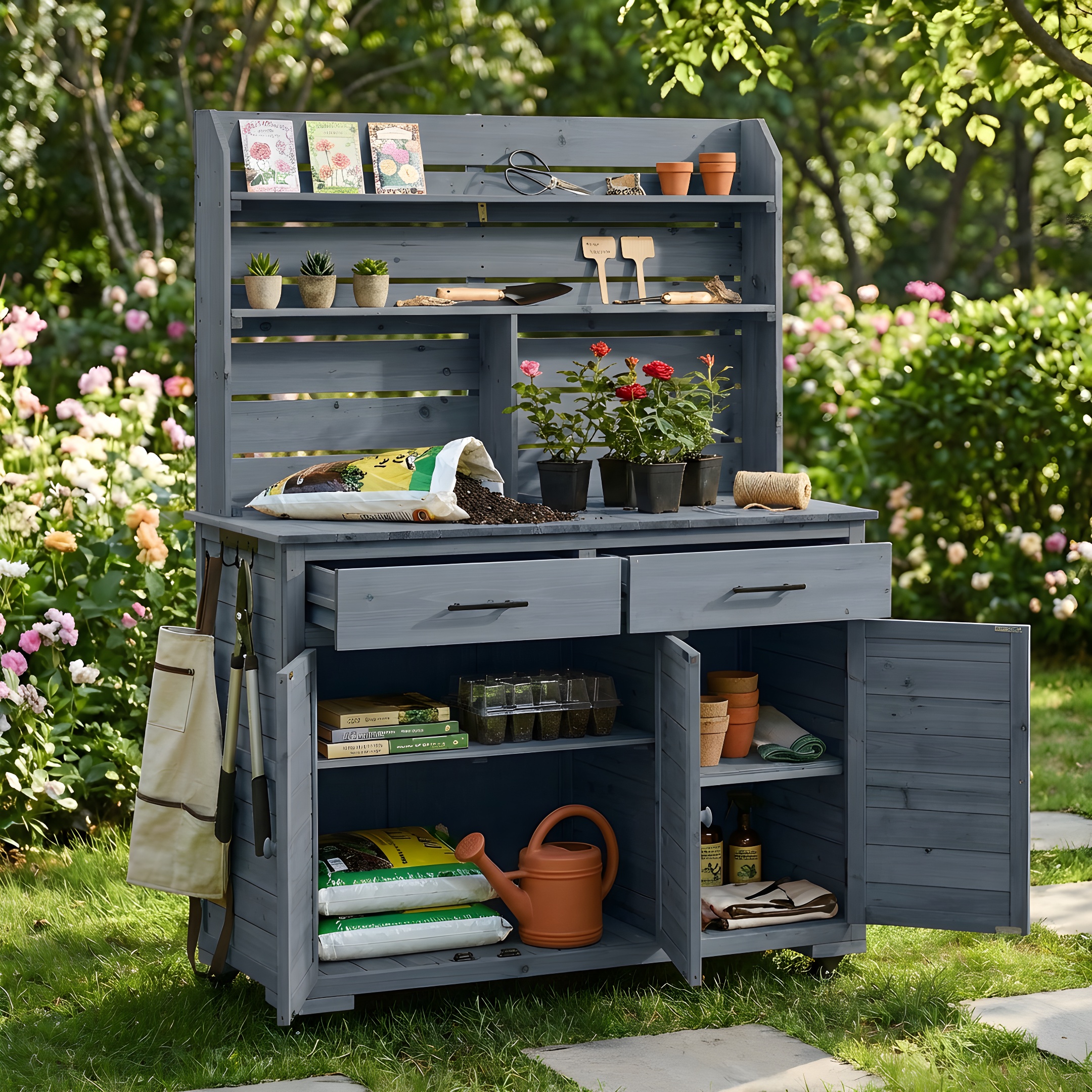 Assembly Video TOPMAx 65 H Large Garden Potting Bench With Lockable Wheels And Storage Cabinet Wood Outdoor Kitchen Island Prep Cart With Hutch Top Drawers And Removal Shelves For Grilling Gray