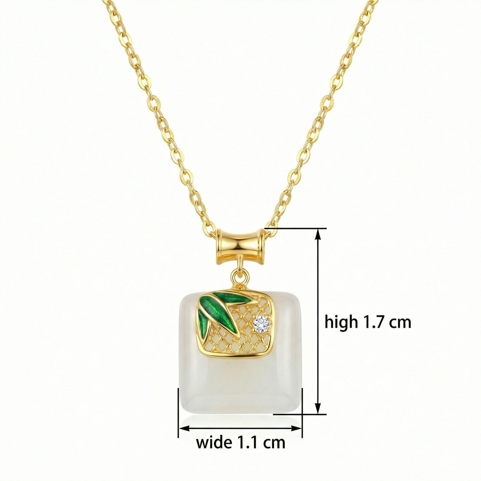 925 Sterling Silver Elegant Square White Jade Pendant Necklace with Green Bamboo Leaf and Sparkling Stone Accent