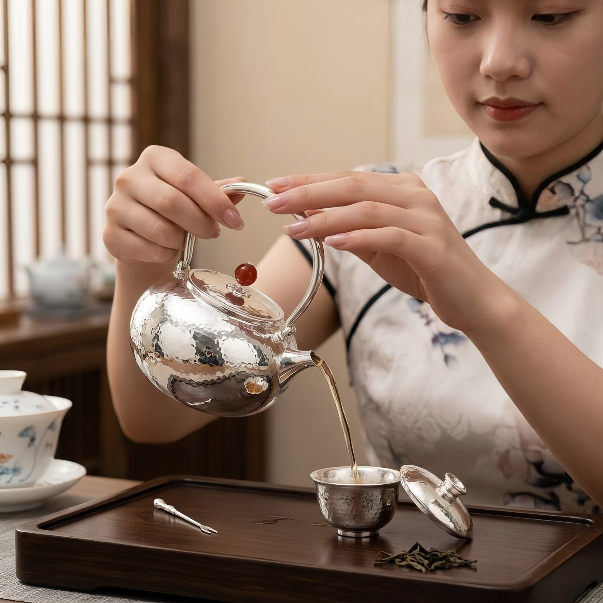 925 Sterling Silver Elegant Hand-Hammered Silver Teapot with Red Gemstone Finial and Polished Arched Handle - Handicraft