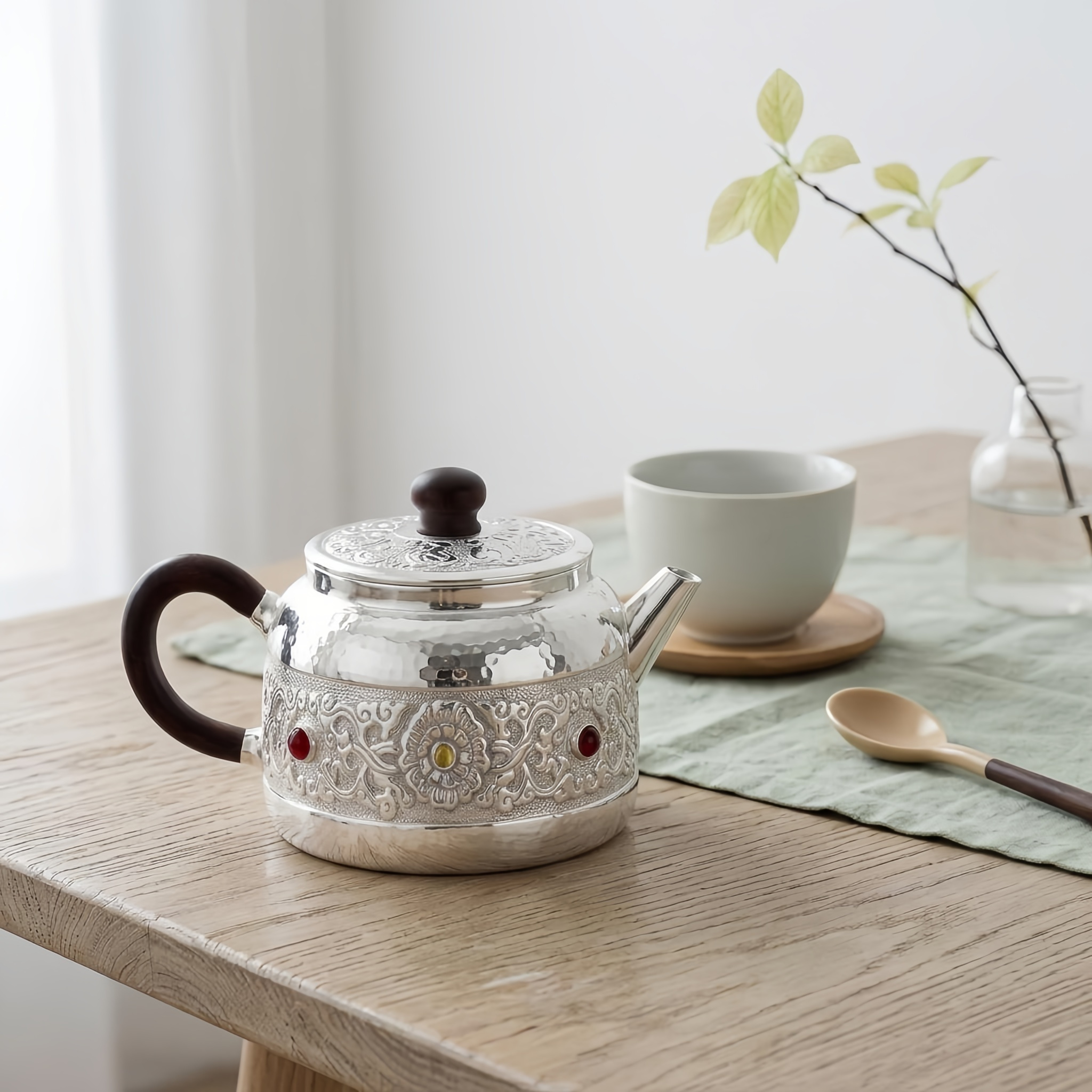 925 Sterling Silver Ornate Hammered Silver Teapot with Floral Engravings, Gemstone Accents, and Elegant Wooden Handle - Handicraft