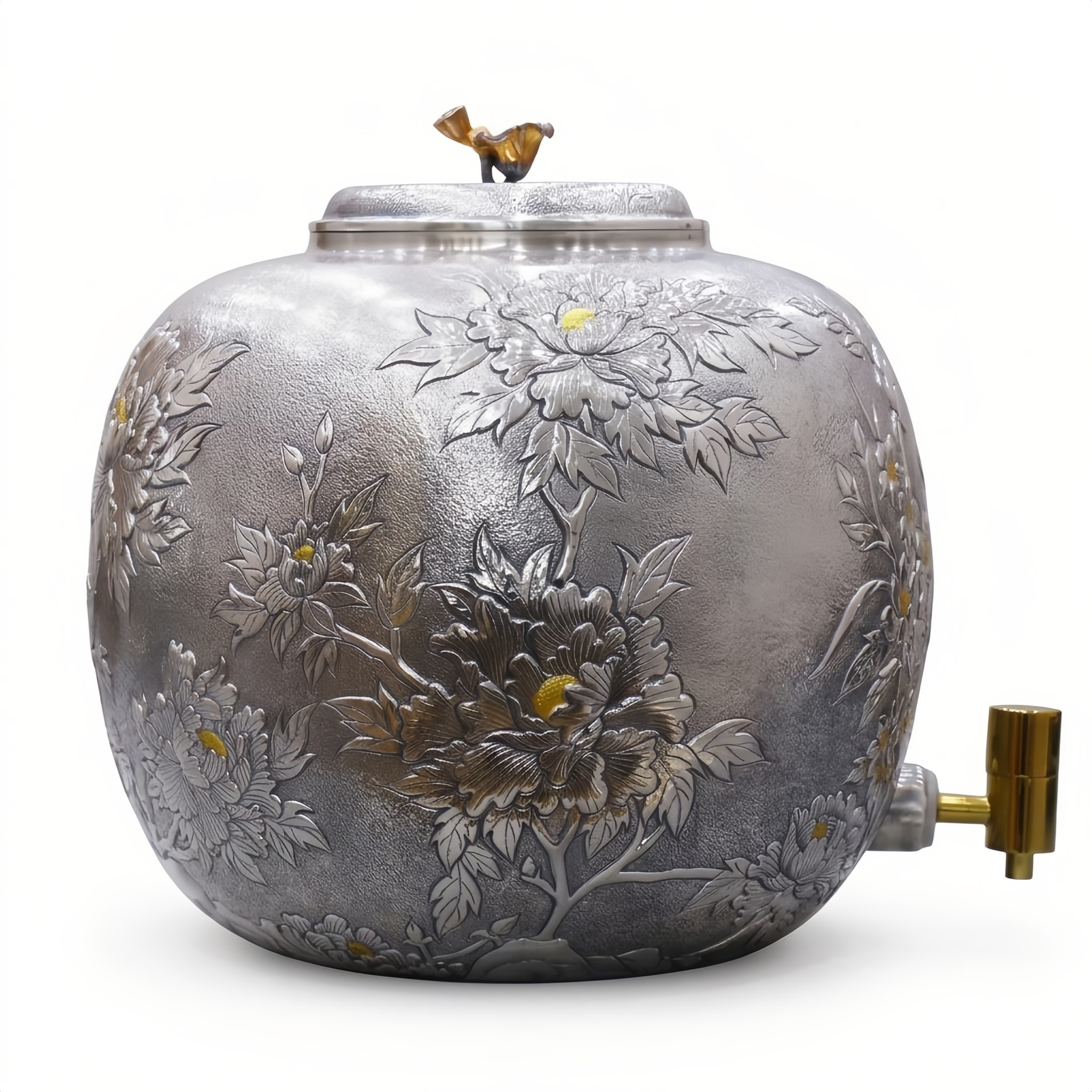 925 Sterling Silver Ornate Hand-Carved Silver Floral Dispenser with Bird Handle and Brass Spigot - Handicraft