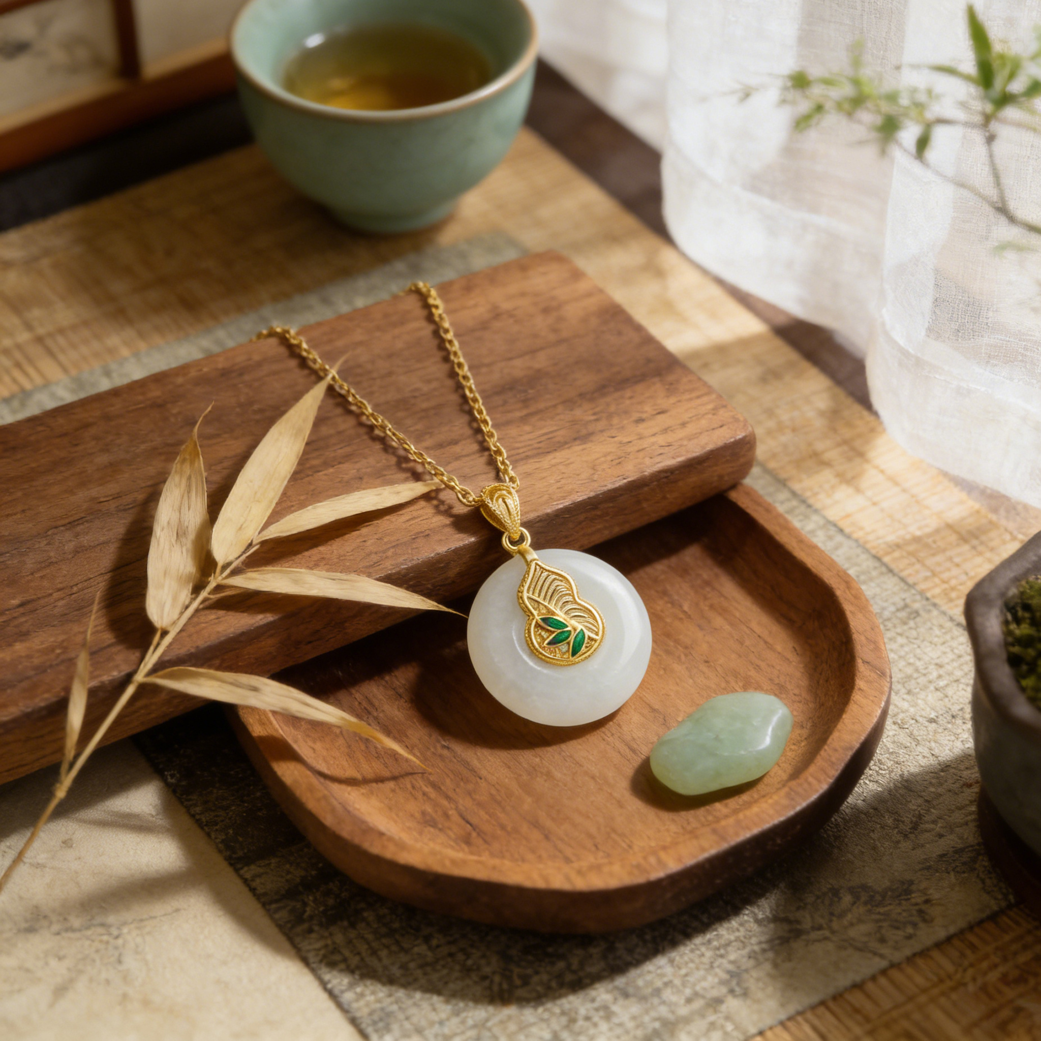 925 Sterling Silver Elegant White Jade-Style Circular Pendant with Bamboo-Themed Gourd Ornament