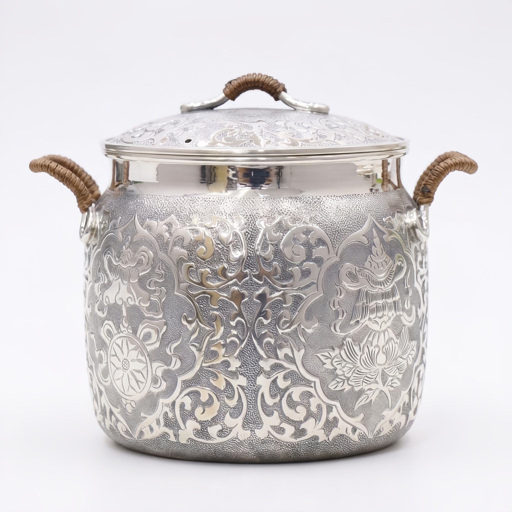 925 Sterling Silver Antique Pot with Intricate Floral Engraving and Wooden Handles-Premium Hot Pot - Handicraft
