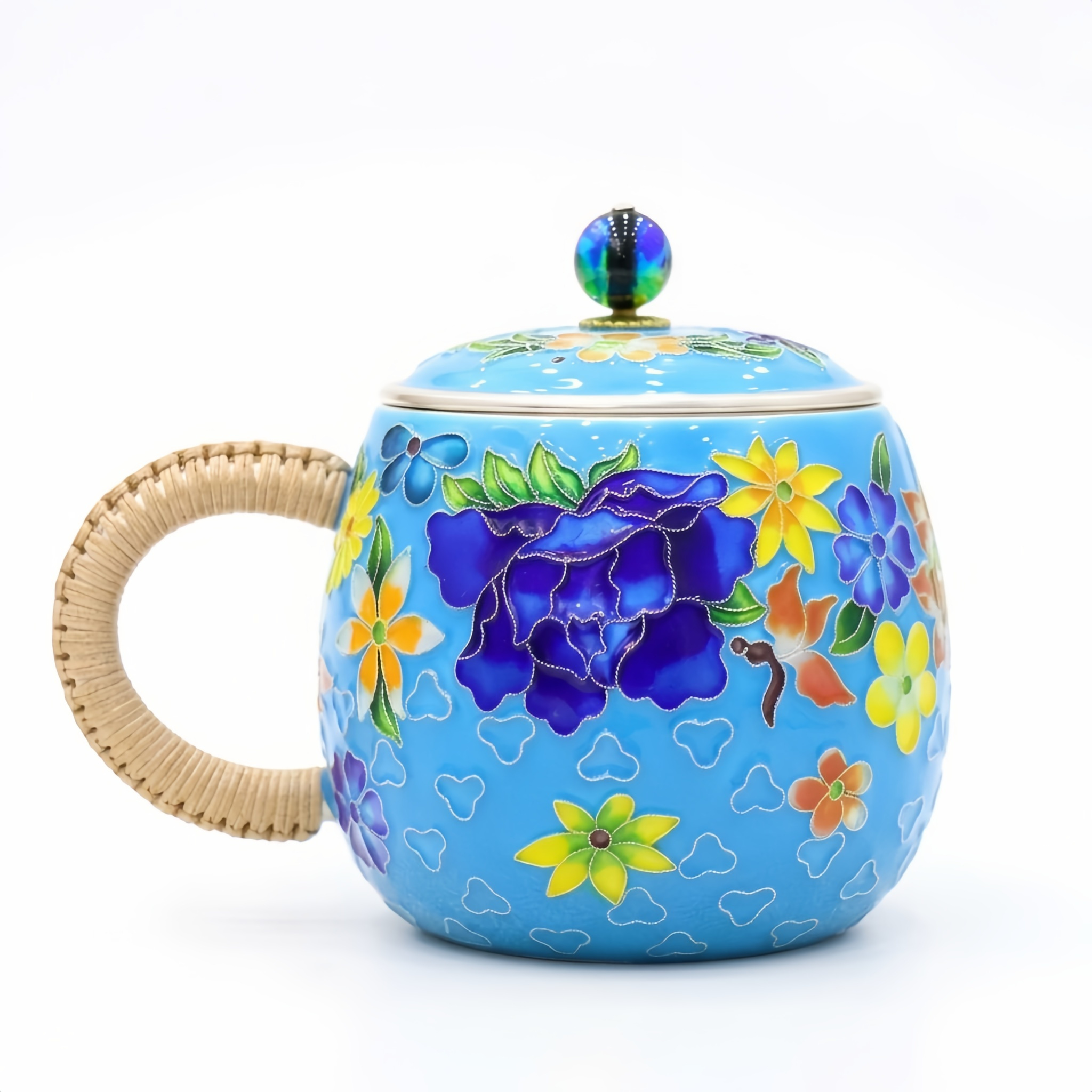 925 Sterling Silver Vibrant Blue Cloisonné Style Floral Mug with Lid and Woven Wicker Handle - Handicraft