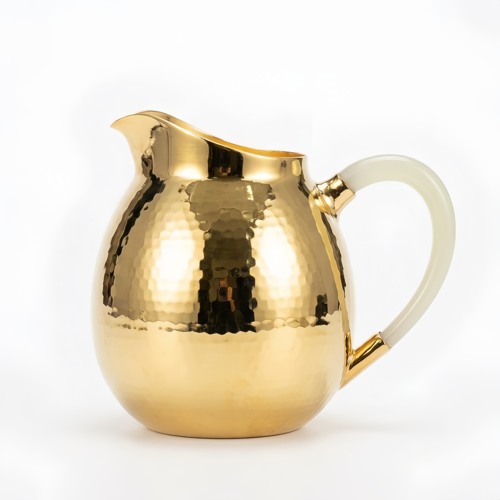 925 Sterling Silver Handcrafted Hammered Brass Pitcher with Elegant Creamy White Handle - Handicraft