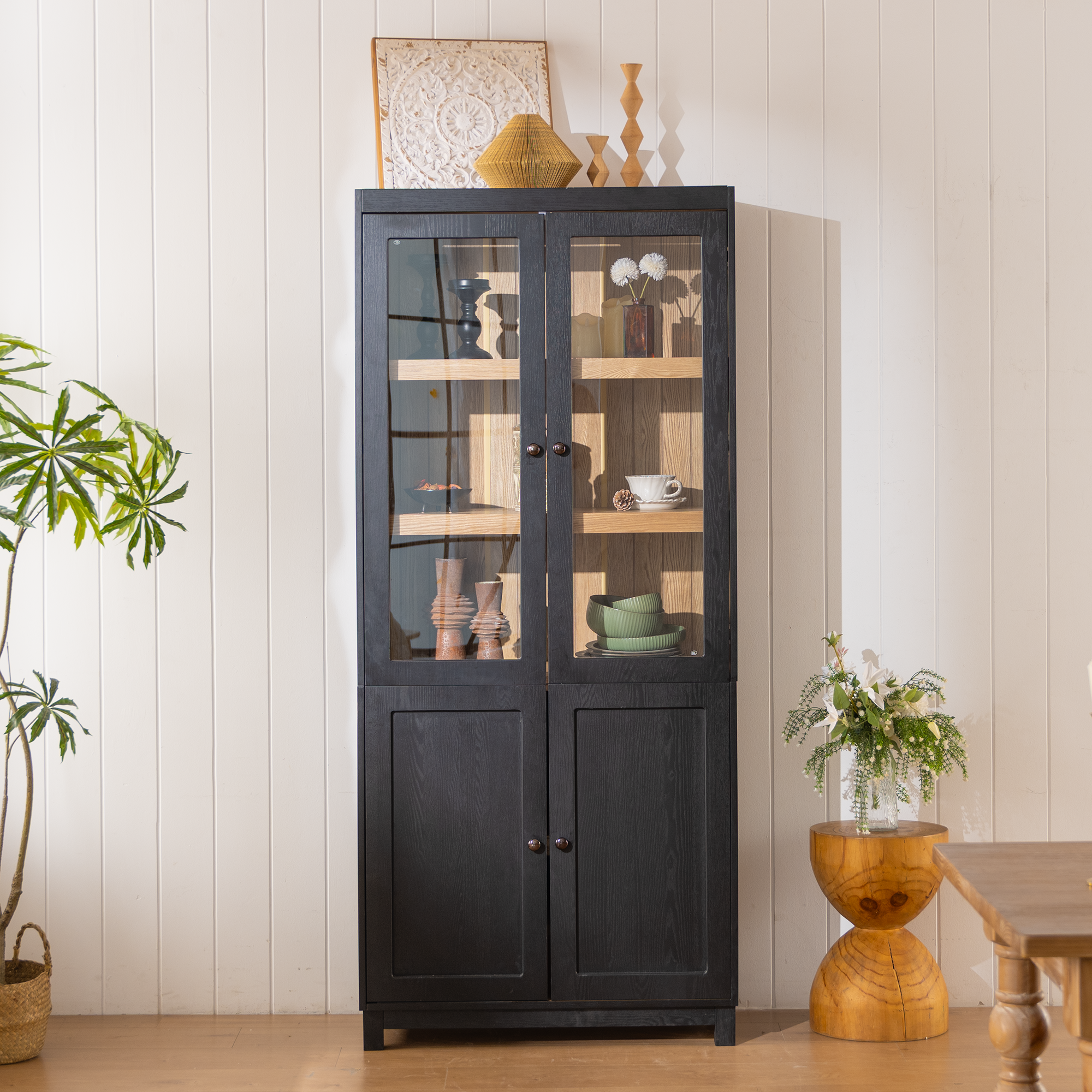 74.5 H Ash Wood Grain Display Cabinet, Bookcase With Glass Doors & Adjustable Shelves, Mid-Century Modern Bookshelf, Curio Cabinet For Hallways, Livingroom Kitchen & Office - Black