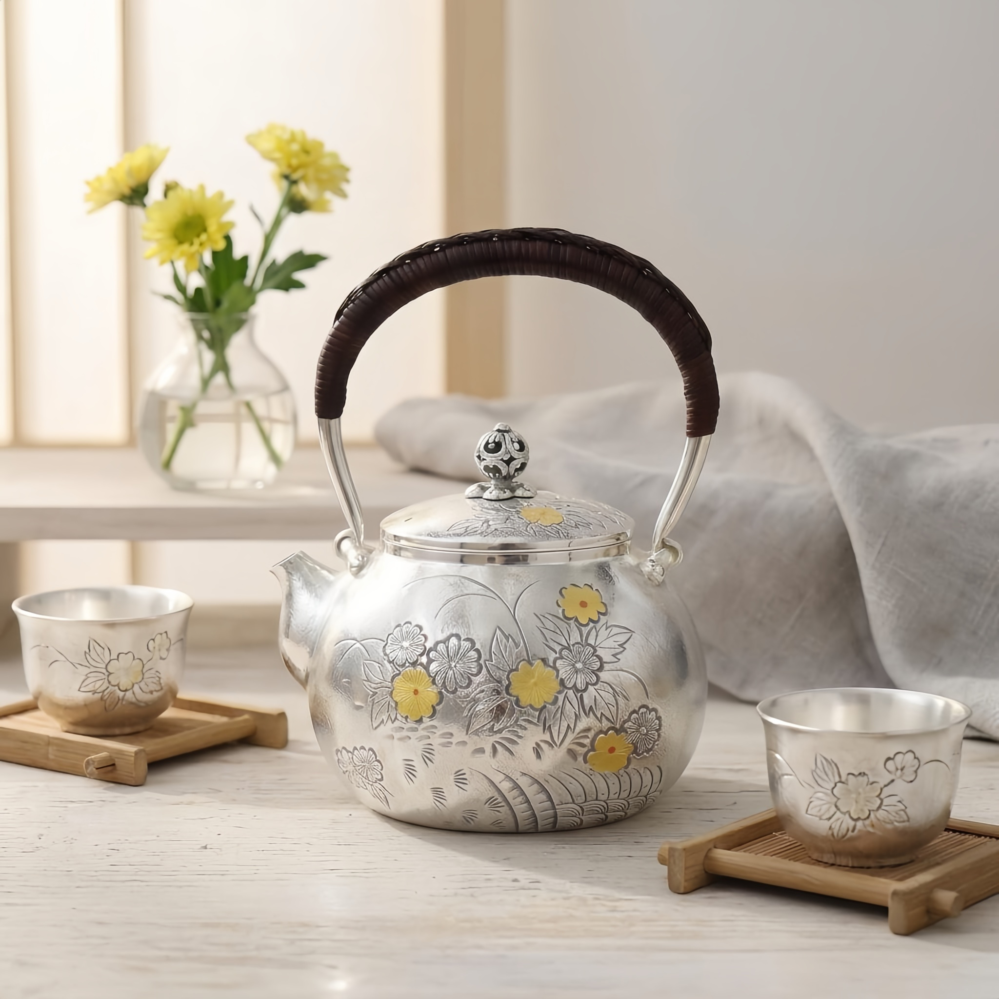 925 Sterling Silver Handcrafted Silver Teapot with Chrysanthemum Engravings and Traditional Woven Handle - Handicraft