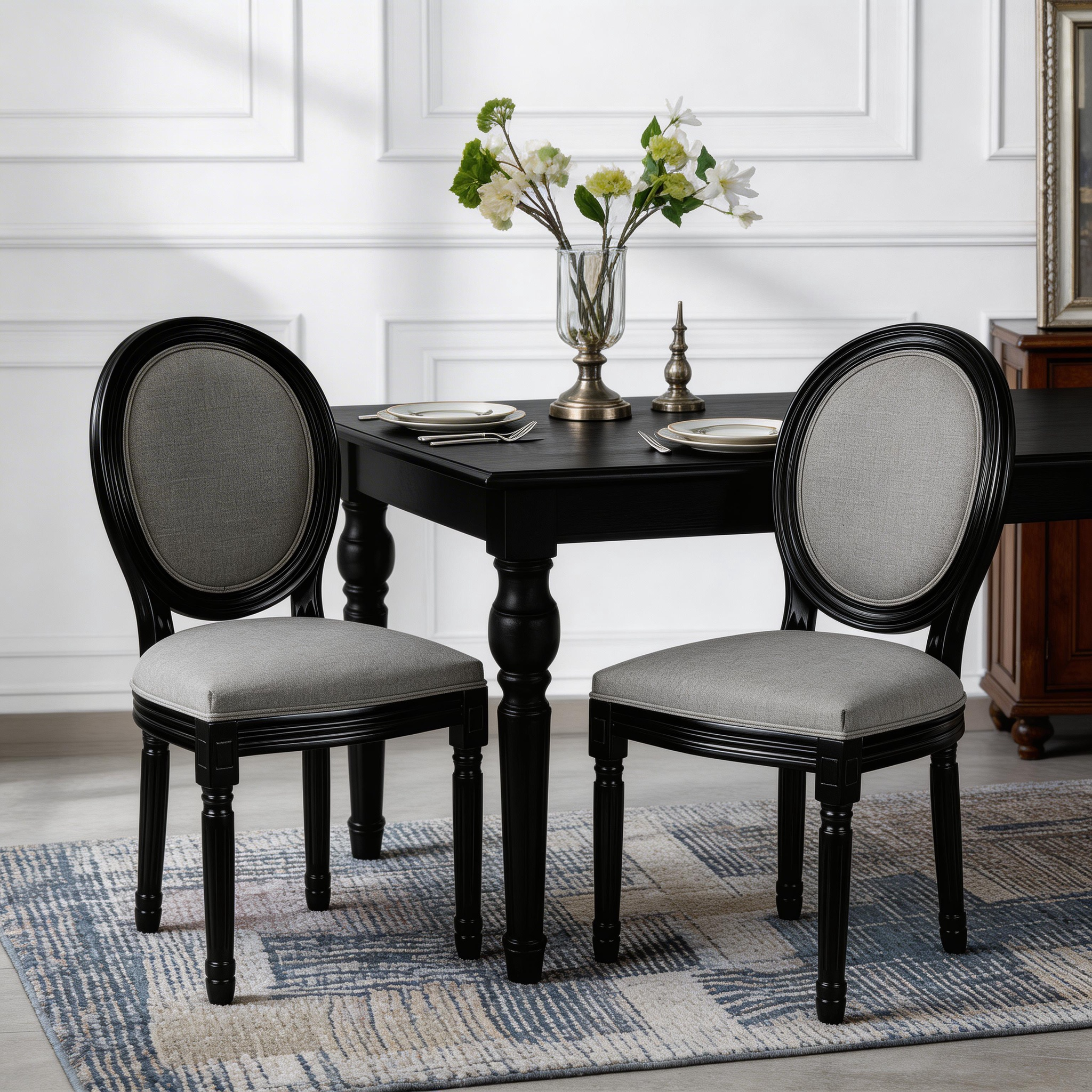 French Country Dining Chairs Set Of 2, Upholstered Chairs With Sponge Round Back , For Living Room, Kitchen , Restaurant Use, Black Solid Wood Frame,Light Grey Fabric