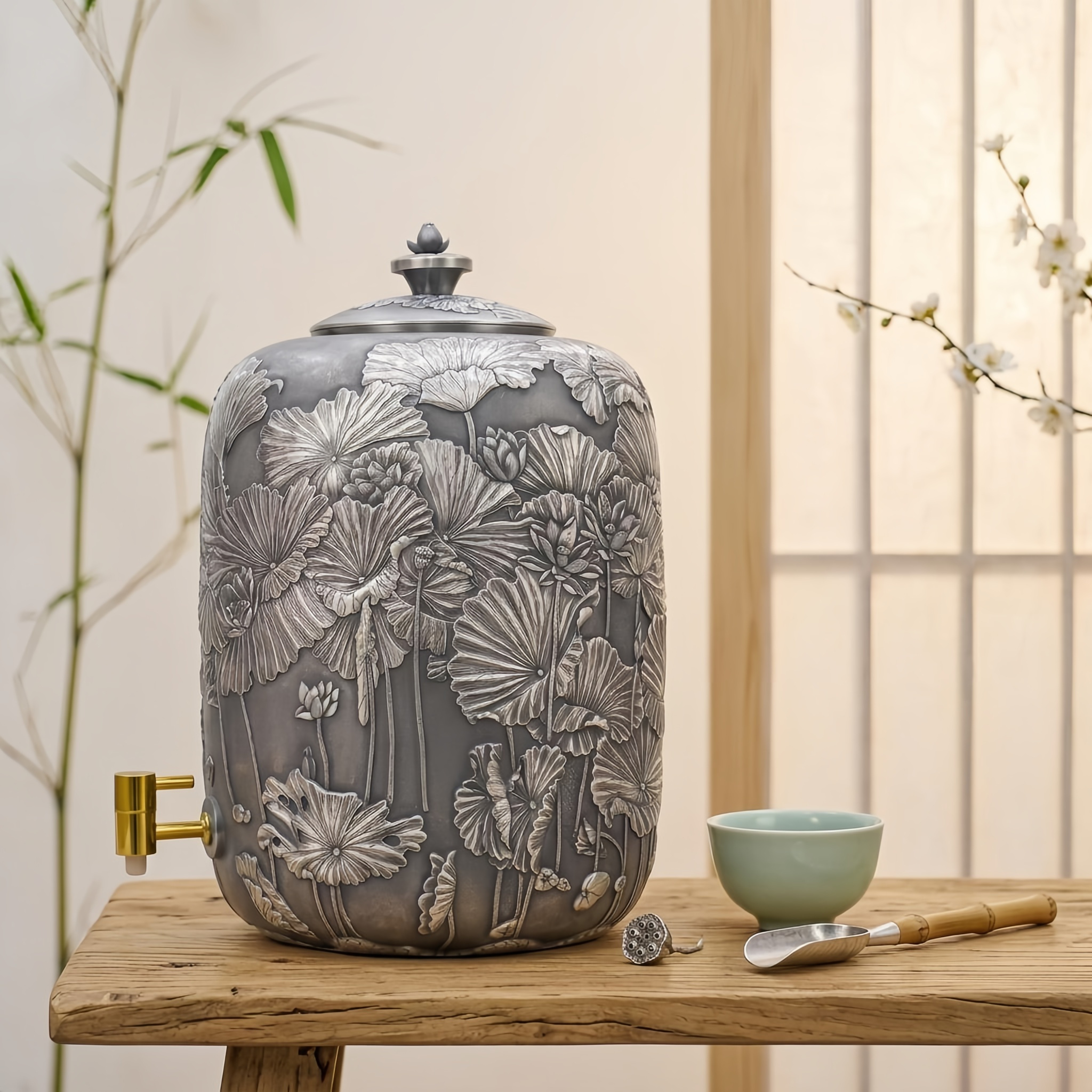 925 Sterling Silver Elaborate Lotus Relief Metal Beverage Urn with Contrasting Metallic Faucet - Handicraft