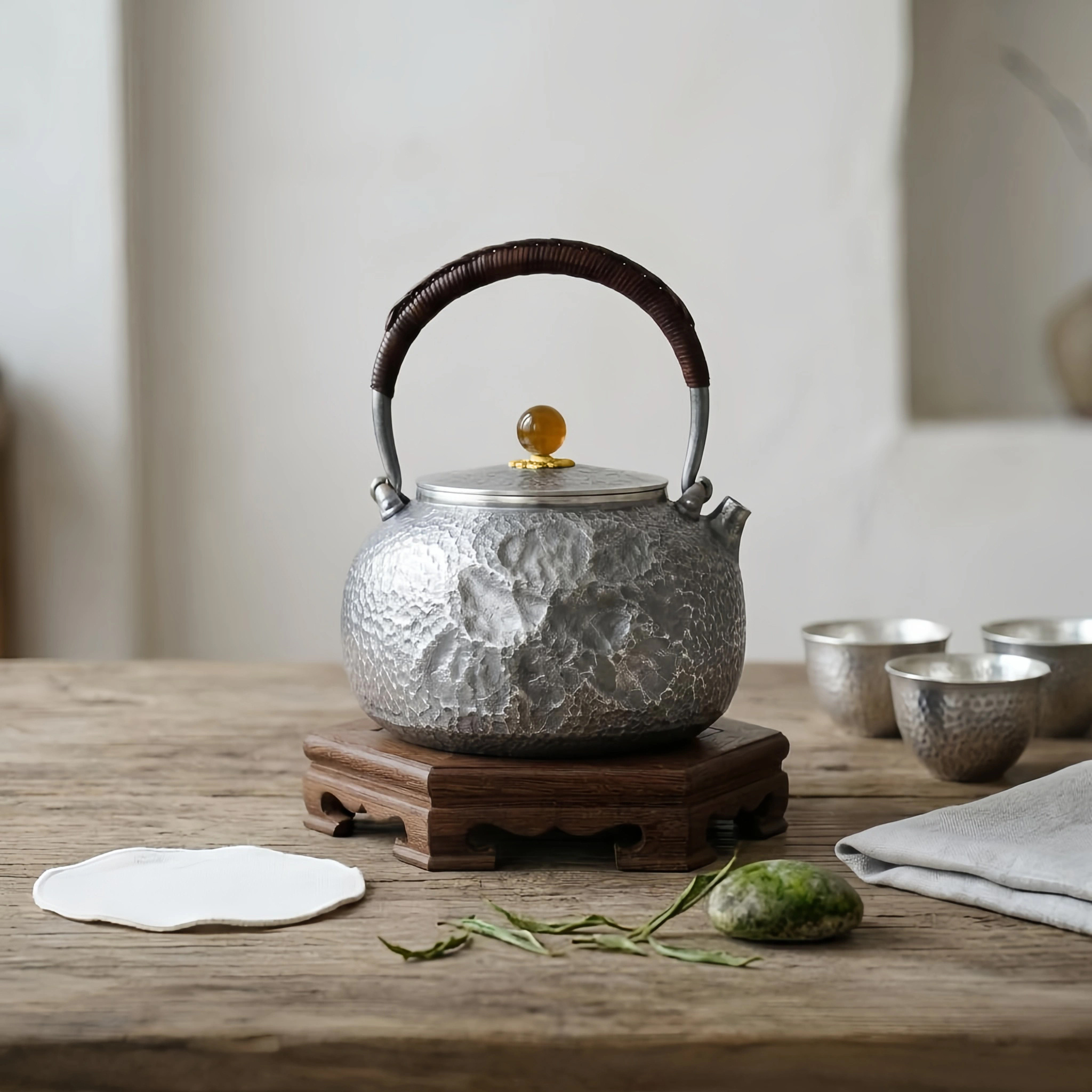925 Sterling Silver Handcrafted Hammered Silver Teapot with Amber Finial and Rattan-Wrapped Handle on Wooden Base - Handicraft