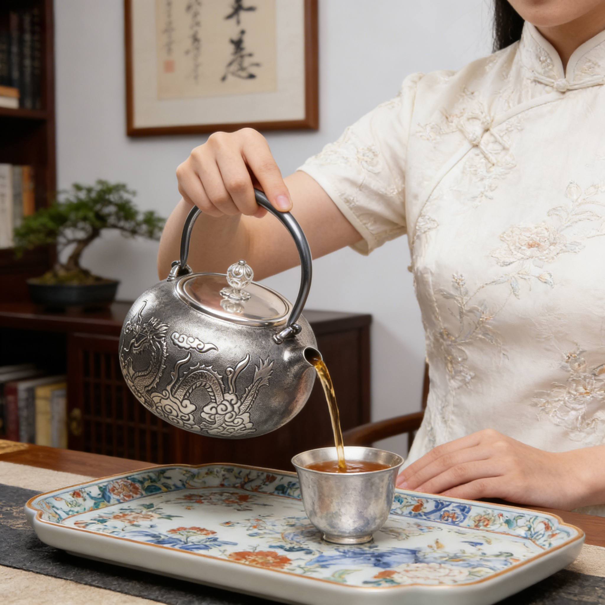 925 Sterling Silver Elegant Handcrafted Silver Teapot Featuring Intricate Dragon Relief and Polished Wooden Stand - Handicraft