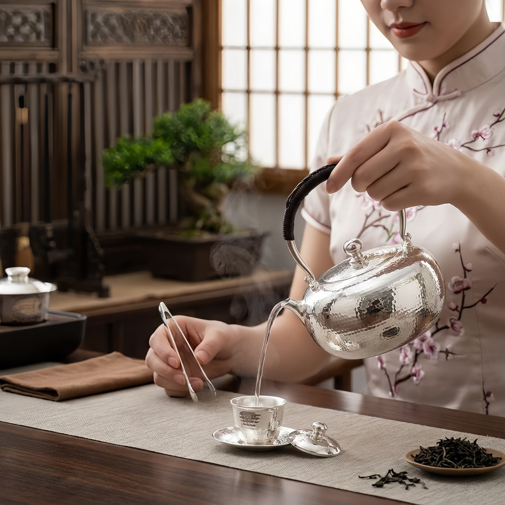 925 Sterling Silver Elegant Hand-Hammered Silver Teapot with Traditional Woven Handle - Handicraft
