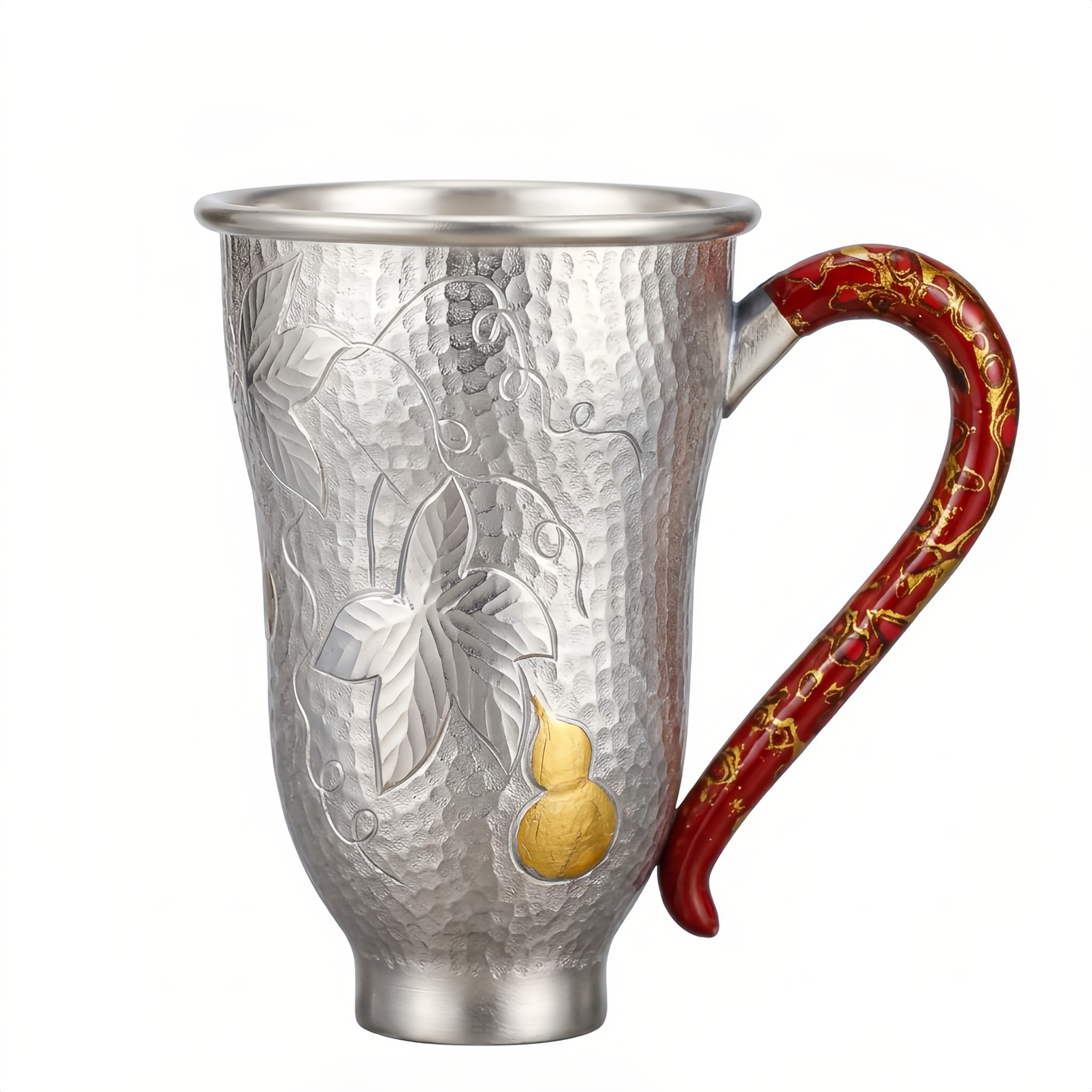 925 Sterling Silver Handcrafted Silver Hammered Cup Featuring Red Lacquered Handle and Gourd Accent - Handicraft