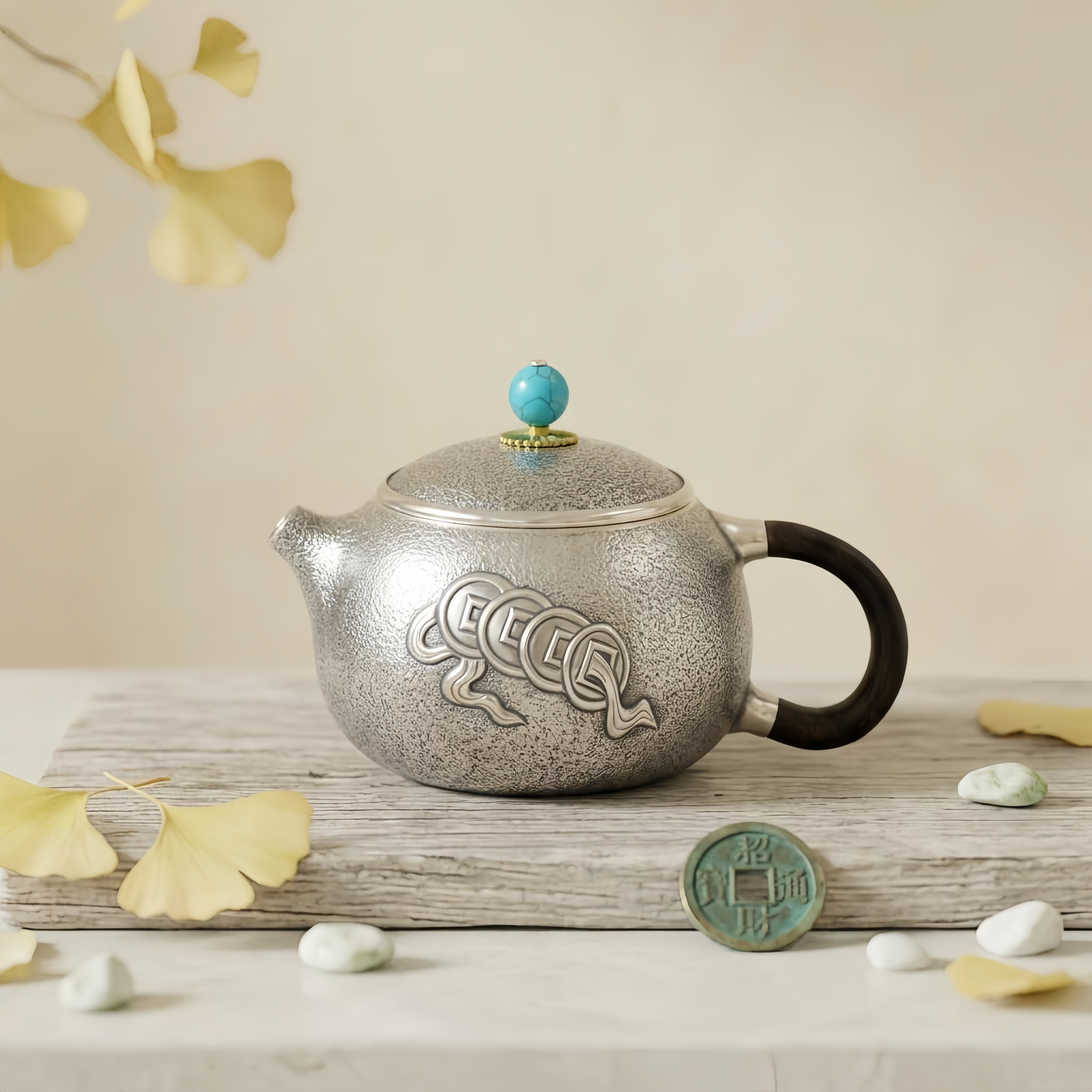 925 Sterling Silver Elegant Teapot with Turquoise Knob and Cloud Motifs-exquisite handmade teapot - Handicraft