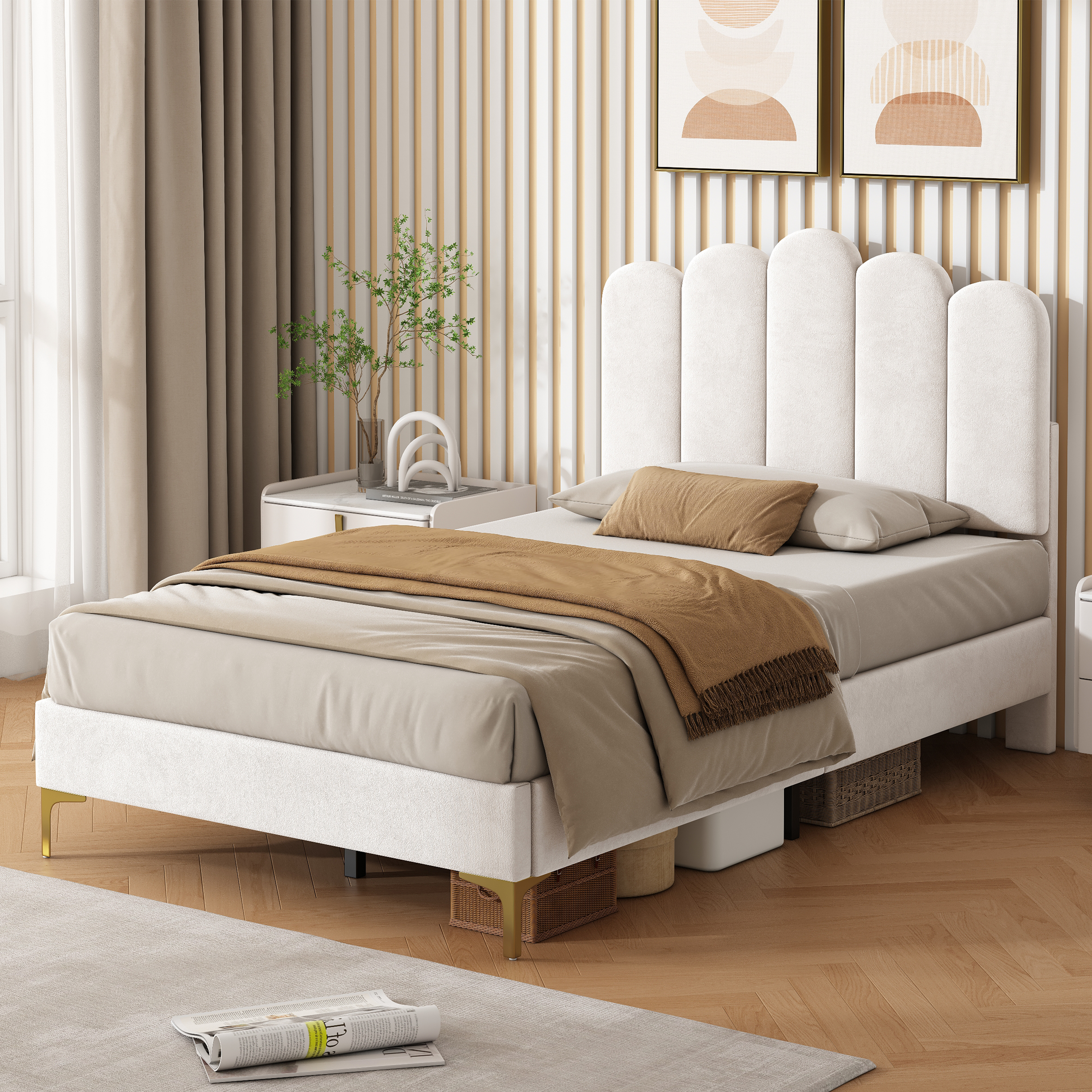 3ft Single Premium Velvet Upholstered Bed Frame With Scalloped Channel Tufted Design, Height Adjustable Headboard & Gold Metal Feet, Under-bed Storage Space, No Box Spring Needed, Beige No Mattress