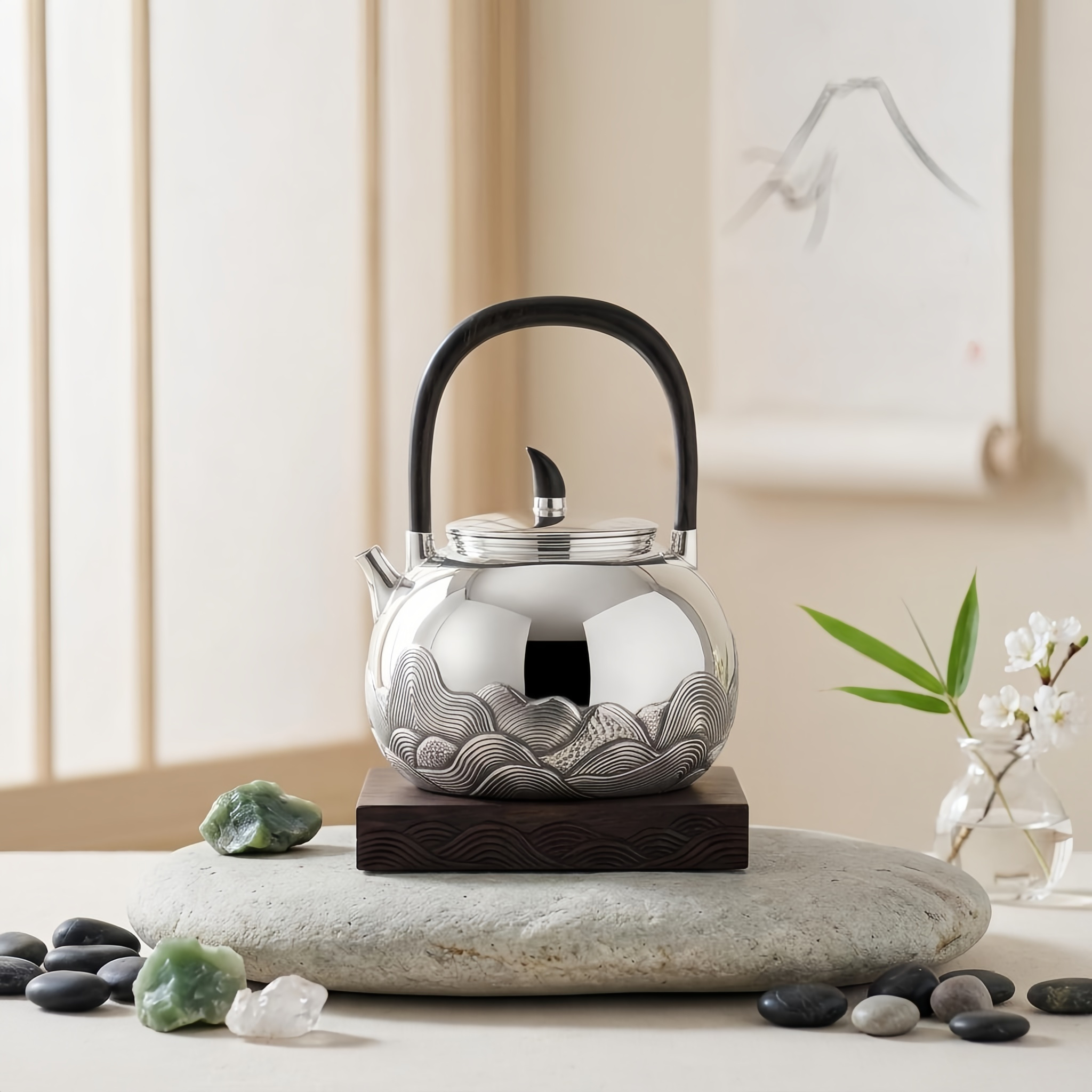 925 Sterling Silver Artisan Sterling Silver Teapot Featuring Hand-Carved Wave Motifs and Sculpted Wood Handle - Handicraft
