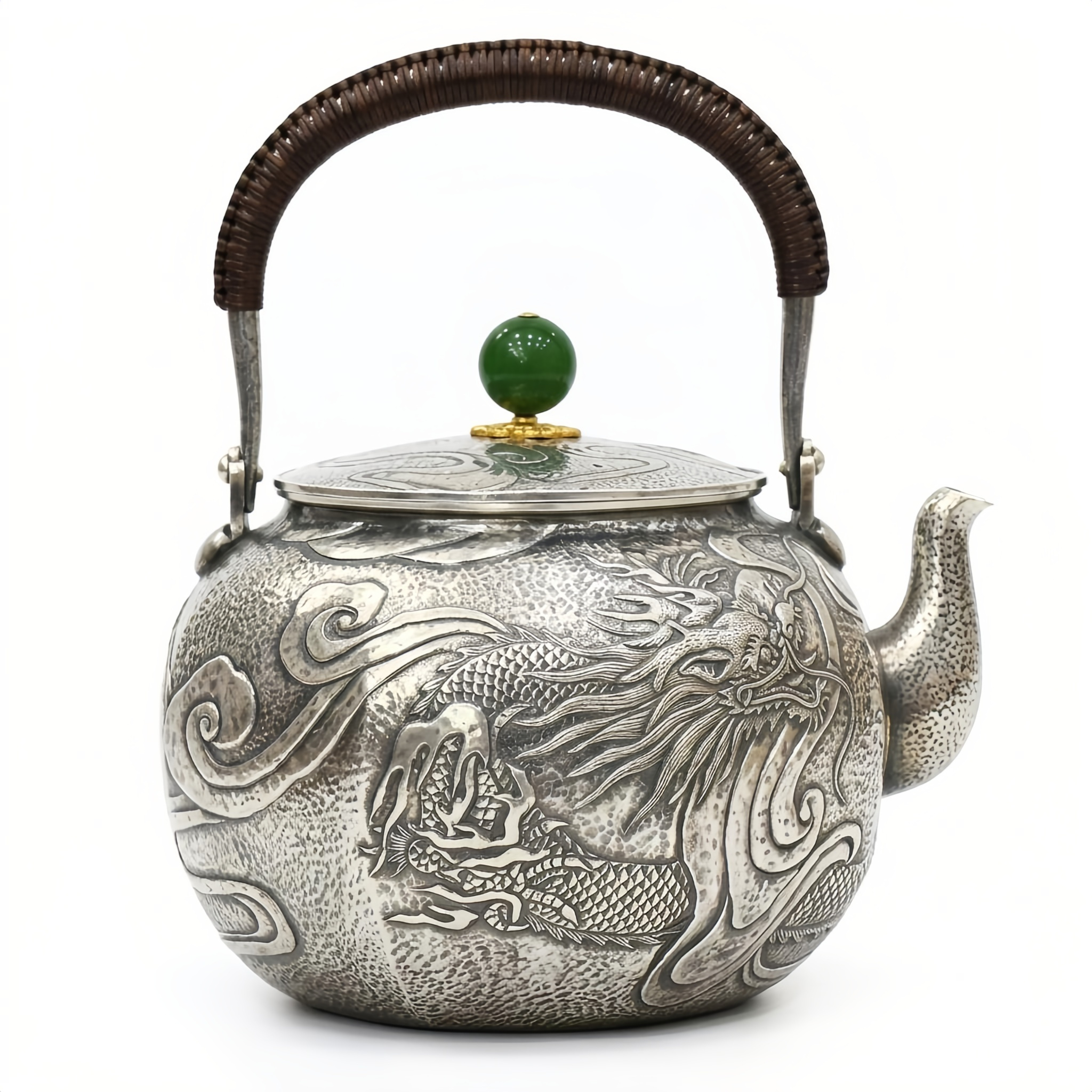 925 Sterling Silver Handcrafted Silver Dragon Teapot with Green Jade Finial and Woven Handle - Handicraft