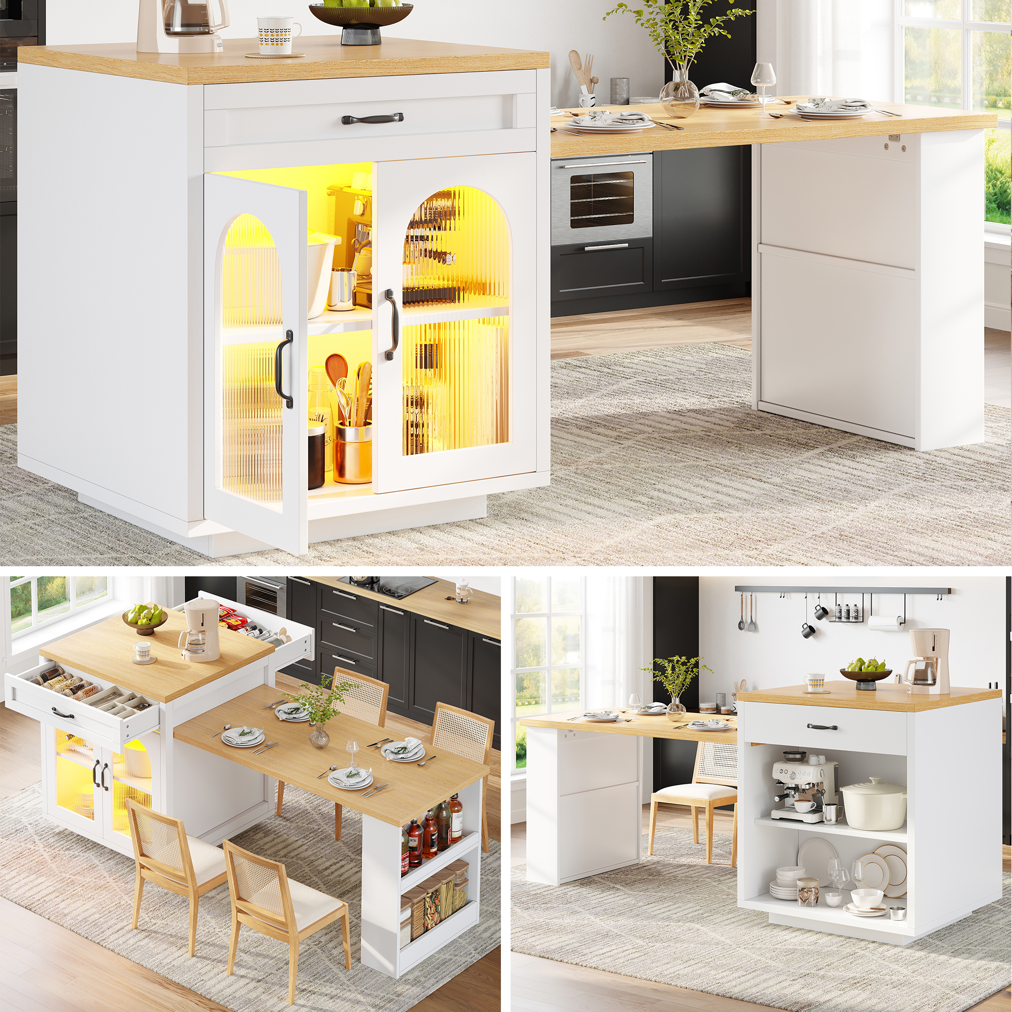 Extendable Kitchen Island With LED Lighting, Modern Storage Cabinet With 2 Drawers & Adjustable Shelves, Kitchen Sideboard With Fluted Glass Doors, MDF Kitchen Countertop For Dining Room