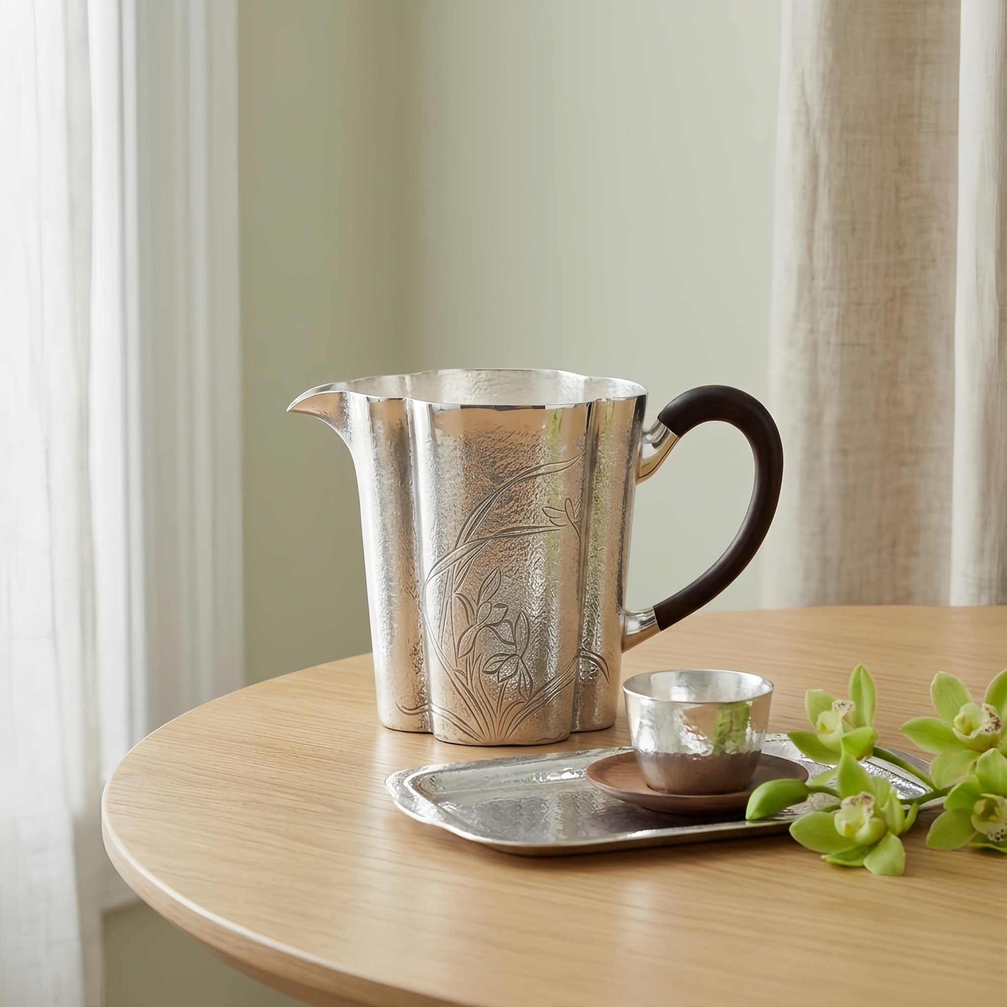 925 Sterling Silver Elegant Hammered Silver Pitcher with Floral Engraving and Dark Wood Handle - Handicraft