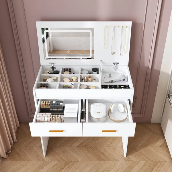 Flip Top Vanity Desk With LED Lighted Mirror & Built-in Outlet - Makeup Vanity Table With 2 Drawers, Open Storage, Hooks For Jewelry (No Stool Included, White)