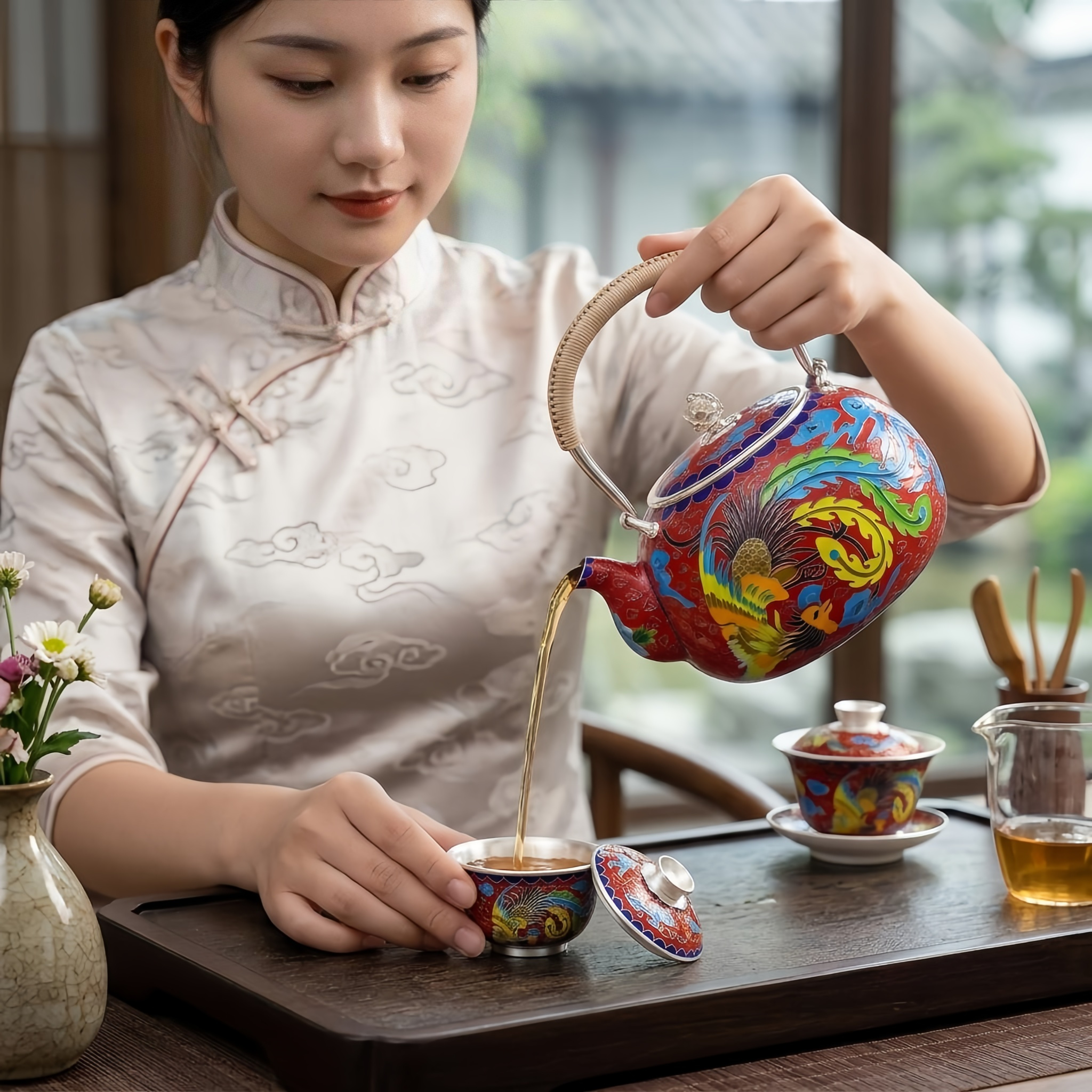 925 Sterling Silver Vibrant Red Cloisonné Phoenix Teapot with Rattan Wrapped Handle and Silver Accents - Handicraft