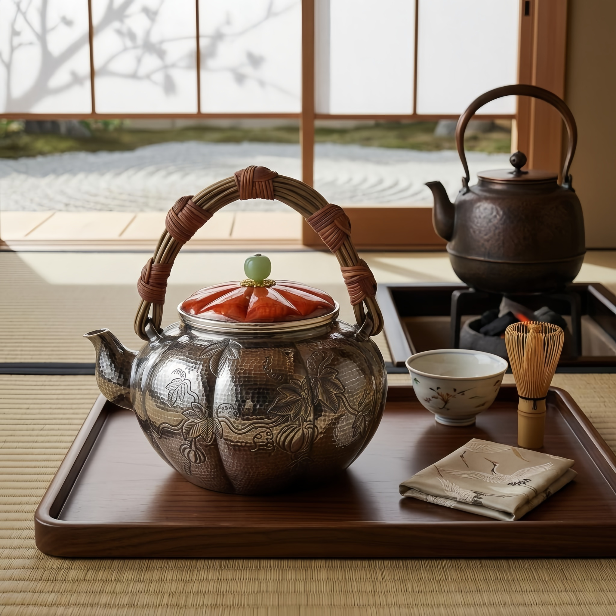 925 Sterling Silver Handcrafted Hammered Silver Teapot with Pumpkin Engravings and Rattan Handle - Handicraft