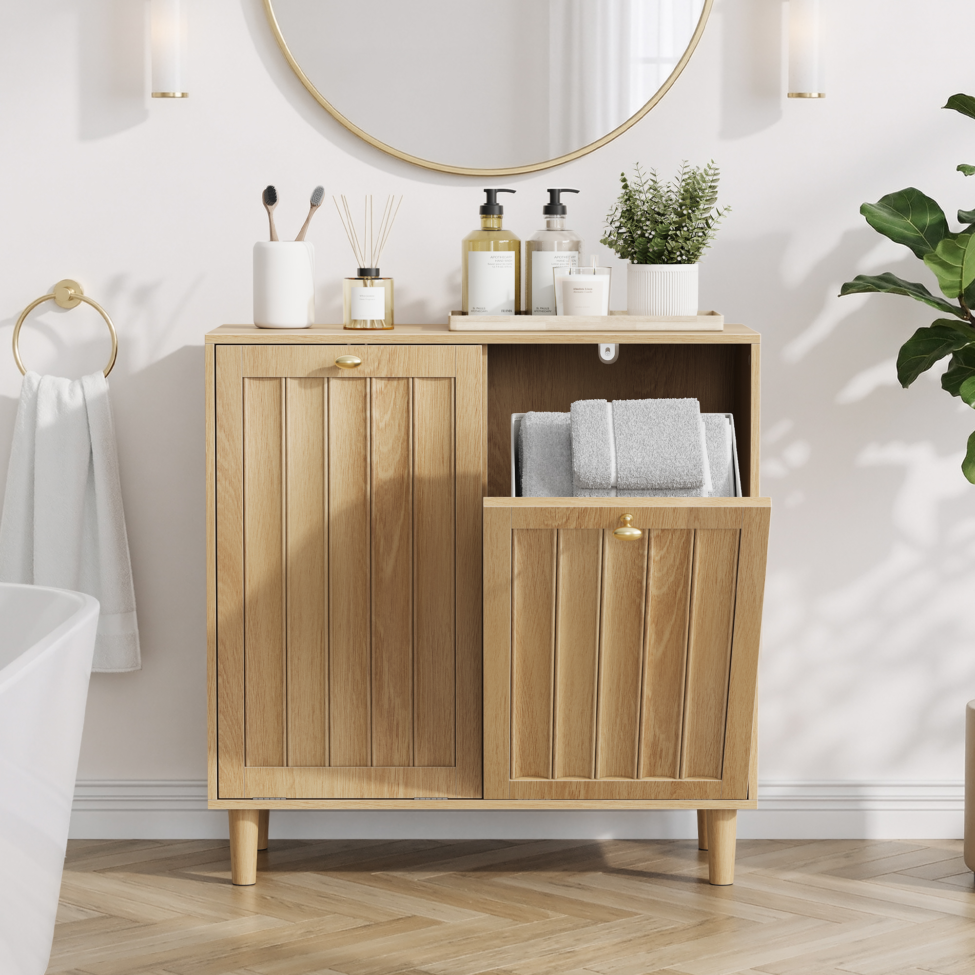 Sloping Laundry Basket With Removable Inner Basket, Concealed Laundry Basket, Bathroom Laundry Storage Cabinet, Freestanding Household Storage Rack, Oak Color