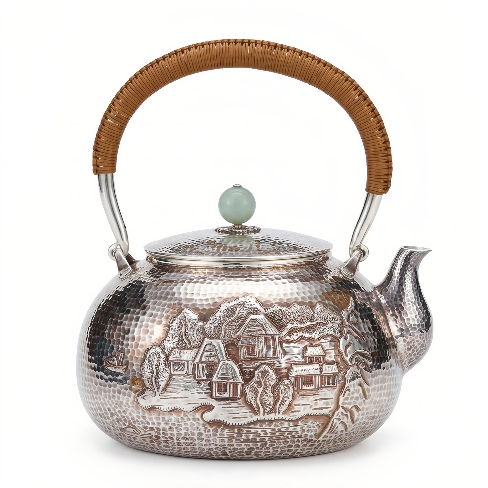 925 Sterling Silver Exquisite Hammered Silver Teapot with Traditional Village Landscape and Woven Handle - Handicraft