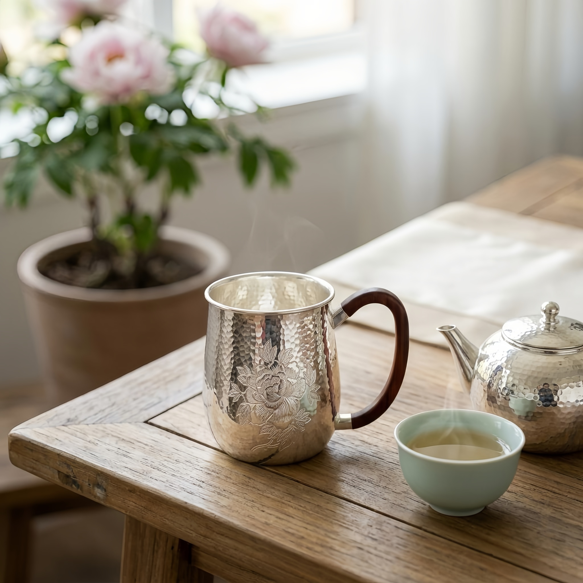925 Sterling Silver Handcrafted Hammered Silver Mug with Intricate Floral Engraving and Wooden Handle - Handicraft