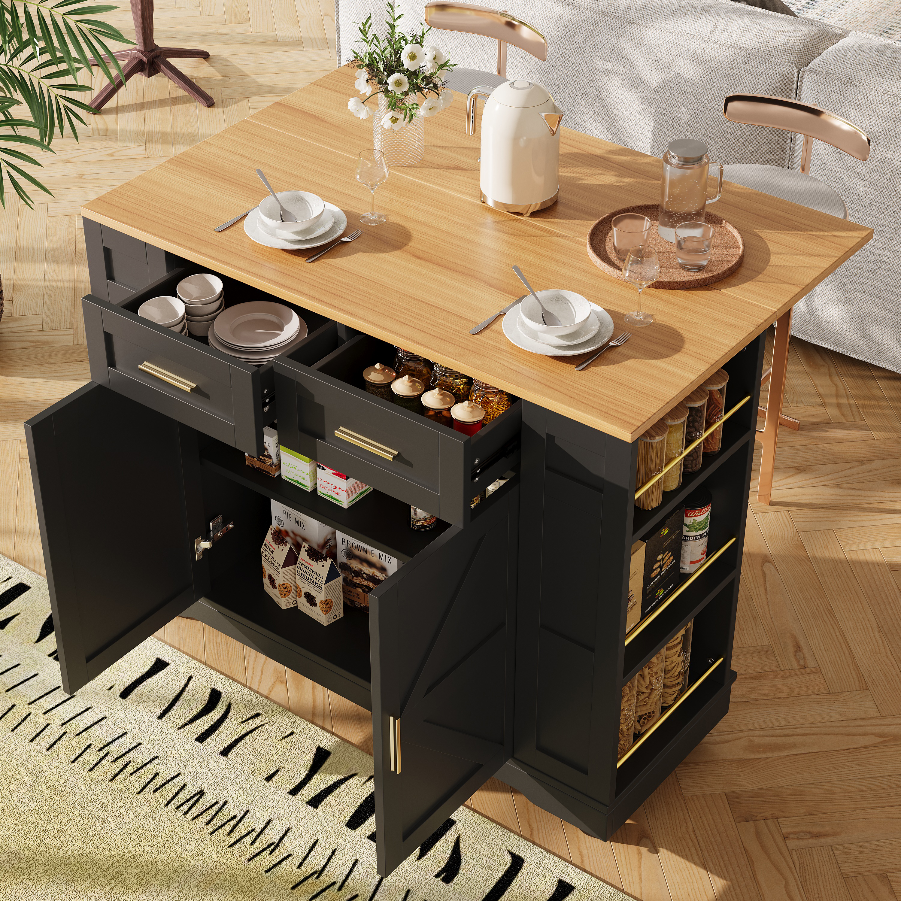 Kitchen Island On Wheels, Rolling Island Cart With 2 Drawers And Double-Sided Storage Racks, Storage Cabinet With Foldable Worktop, Mobile Carts, Portable Trolley For Home And Kitchen, Black