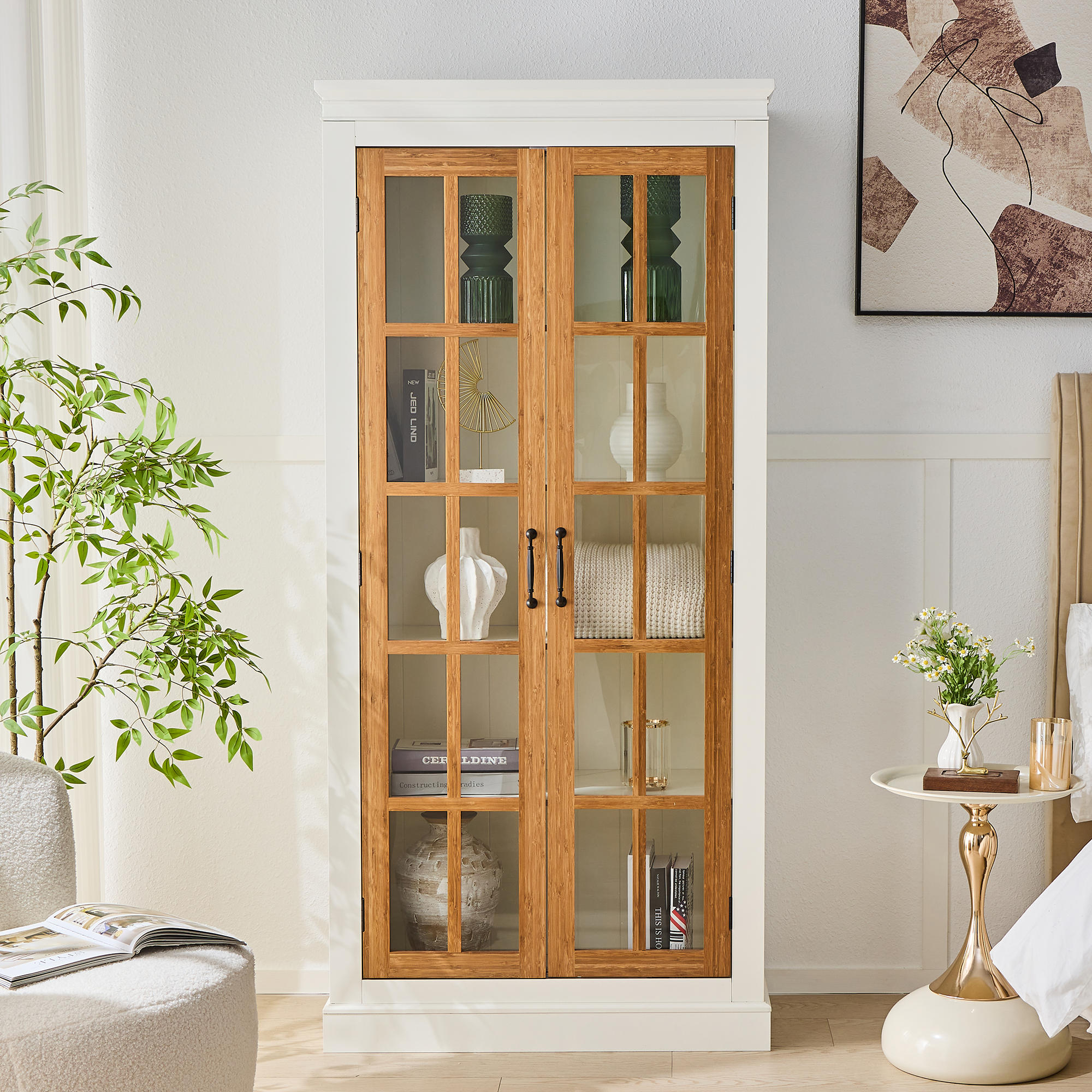 71.2 Freestanding Glass Door Pantry, Farmhouse Style Display Cabinets, Curio Cabinet With Lattice Window For Hallways, Livingroom Kitchen & Office, White & Balck, White & Brown