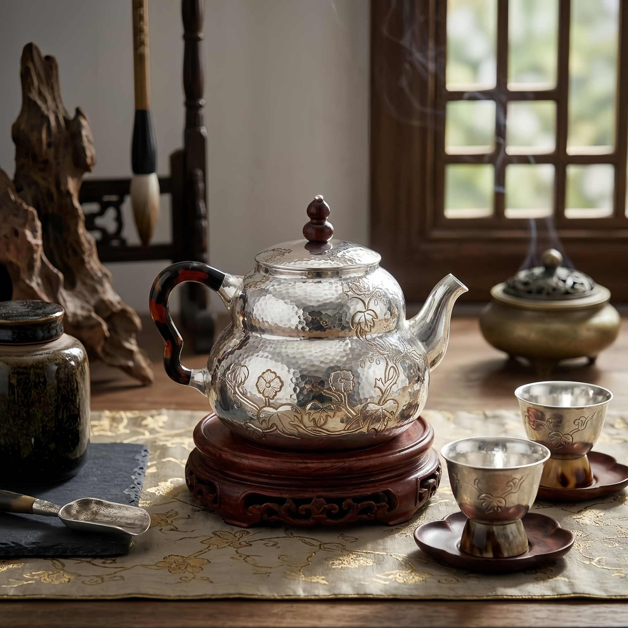 925 Sterling Silver Elegant Hammered Silver Teapot Featuring Intricate Floral Reliefs and Marbled Handle - Handicraft