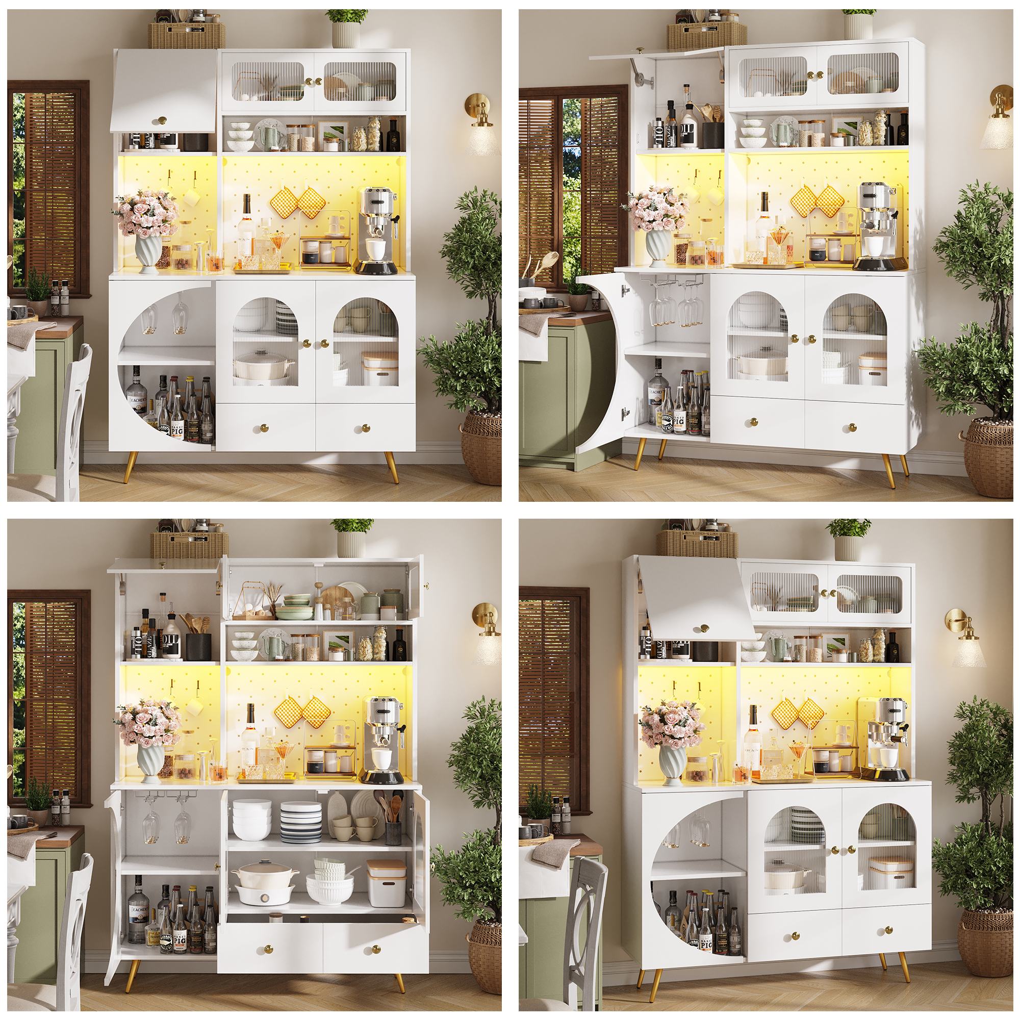 Tall Kitchen Cabinet With LED Lights & USB Ports, Modern Sideboard Storage Cabinet With Power Outlets, Perforated Wall, Drawer & Glass Shelves, For Kitchen & Living Room, 120x40x176 Cm, White
