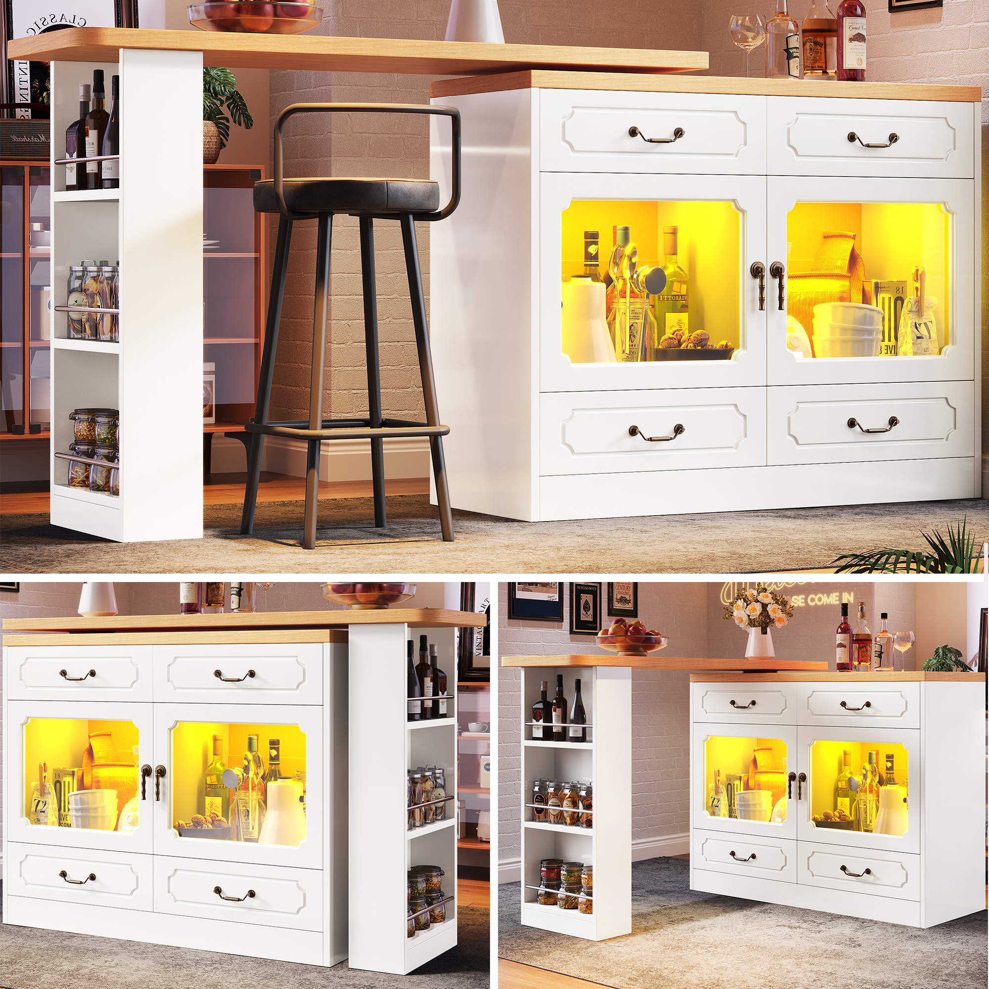 360 Rotating Kitchen Island Bar Table With App Controlled LED Lights, Buffet Sideboard With 4 Drawers & Glass Cabinet, Multifunctional Dining Work Desk For Living Room & Kitchen