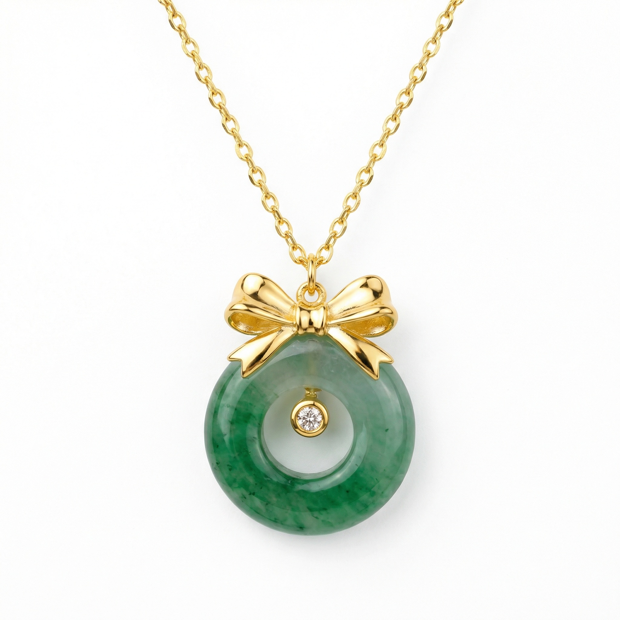 925 Sterling Silver Elegant Green Jadeite Donut Pendant Necklace with Polished Bow and Sparkling CZ Accent