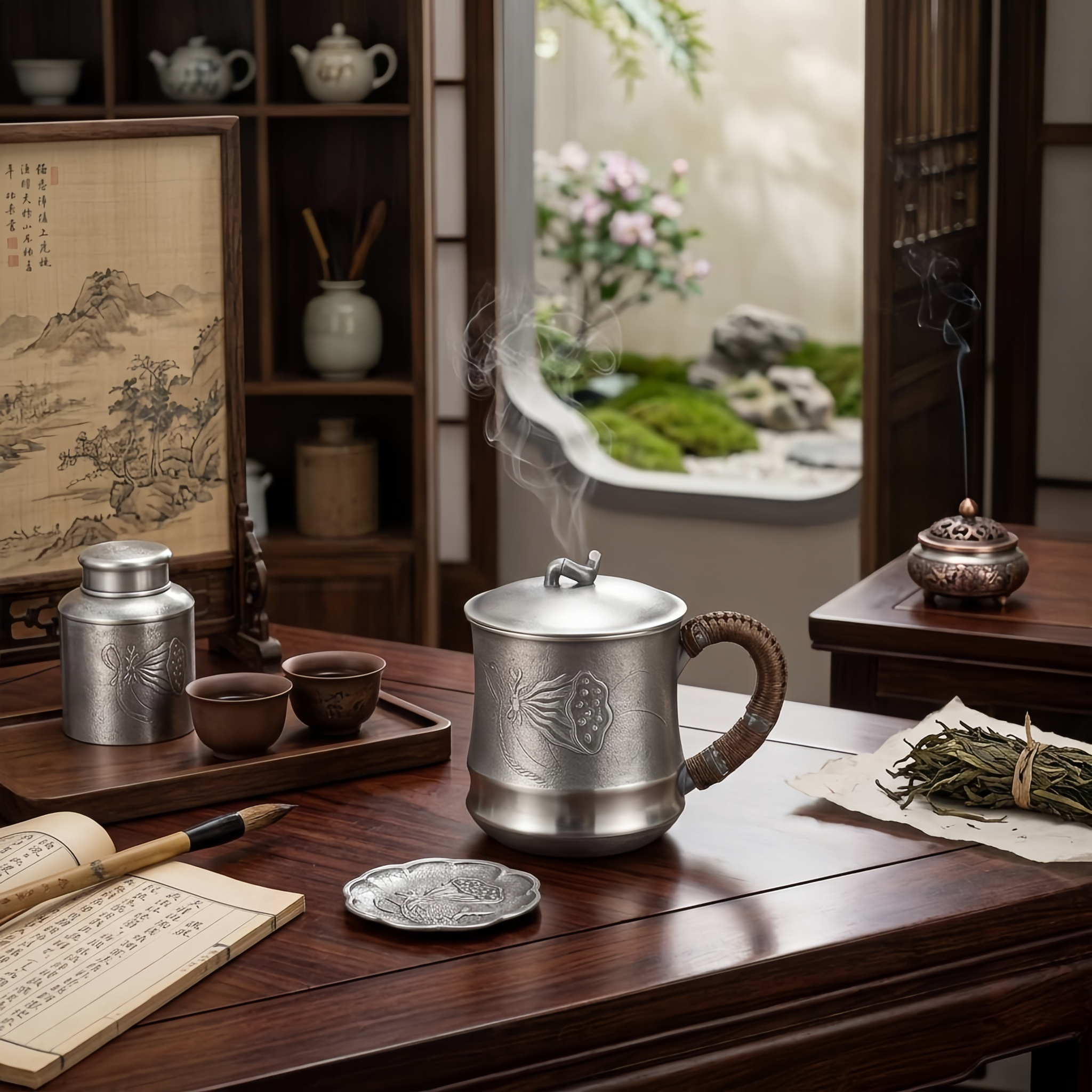 925 Sterling Silver Handcrafted Silver-Tone Mug with Lotus Engraving and Woven Rattan Handle - Handicraft