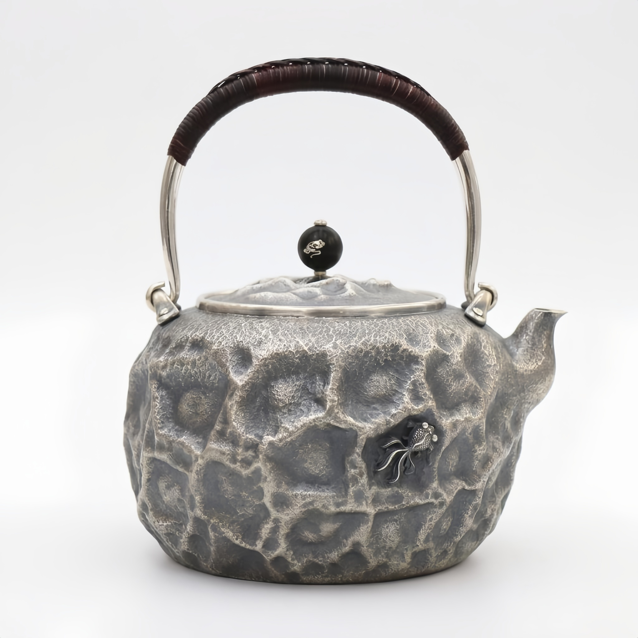 925 Sterling Silver Stone-Textured Teapot with Intricate Fish Ornament and Wooden Handle-Fine large teapot - Handicraft