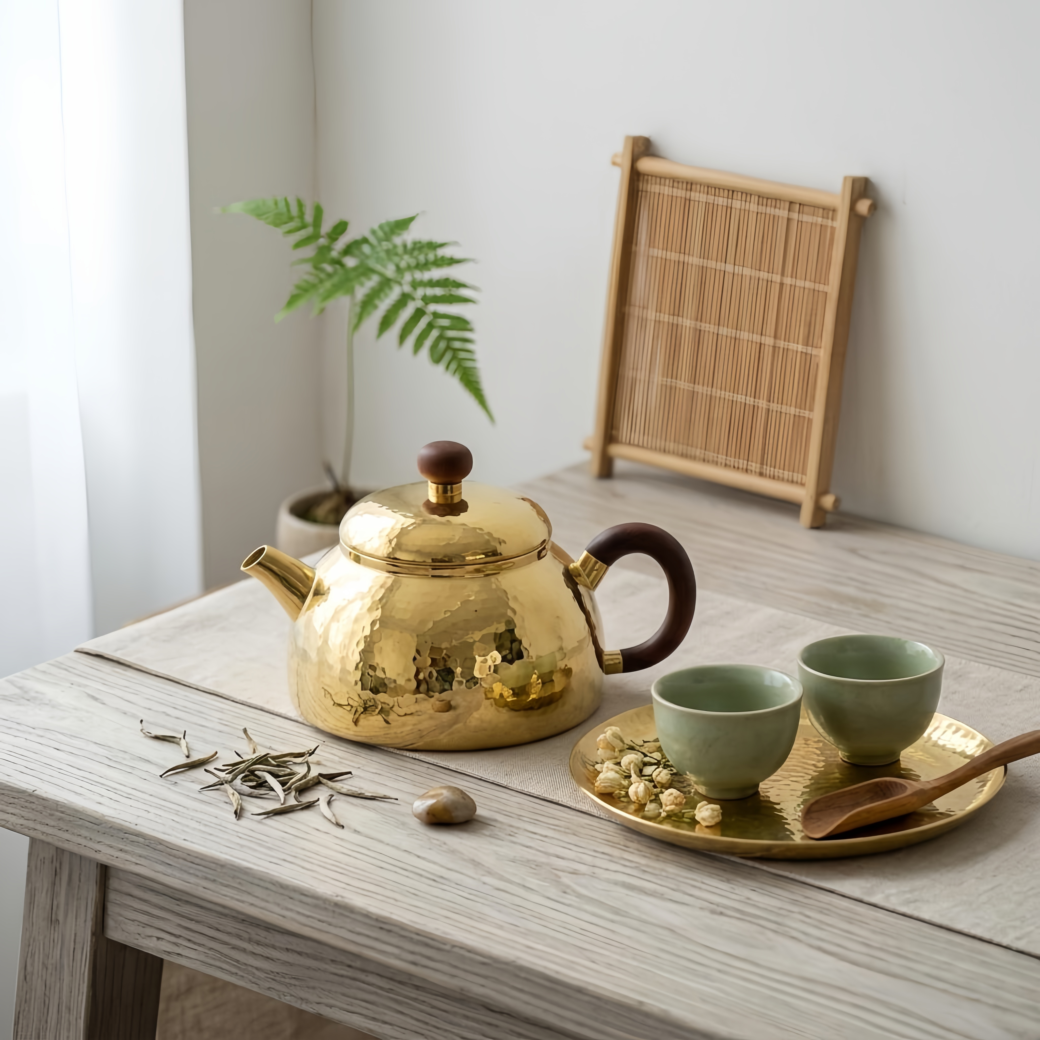 925 Sterling Silver Hammered Brass-Tone Metallic Teapot with Elegant Handcrafted Wooden Handle and Accents - Handicraft