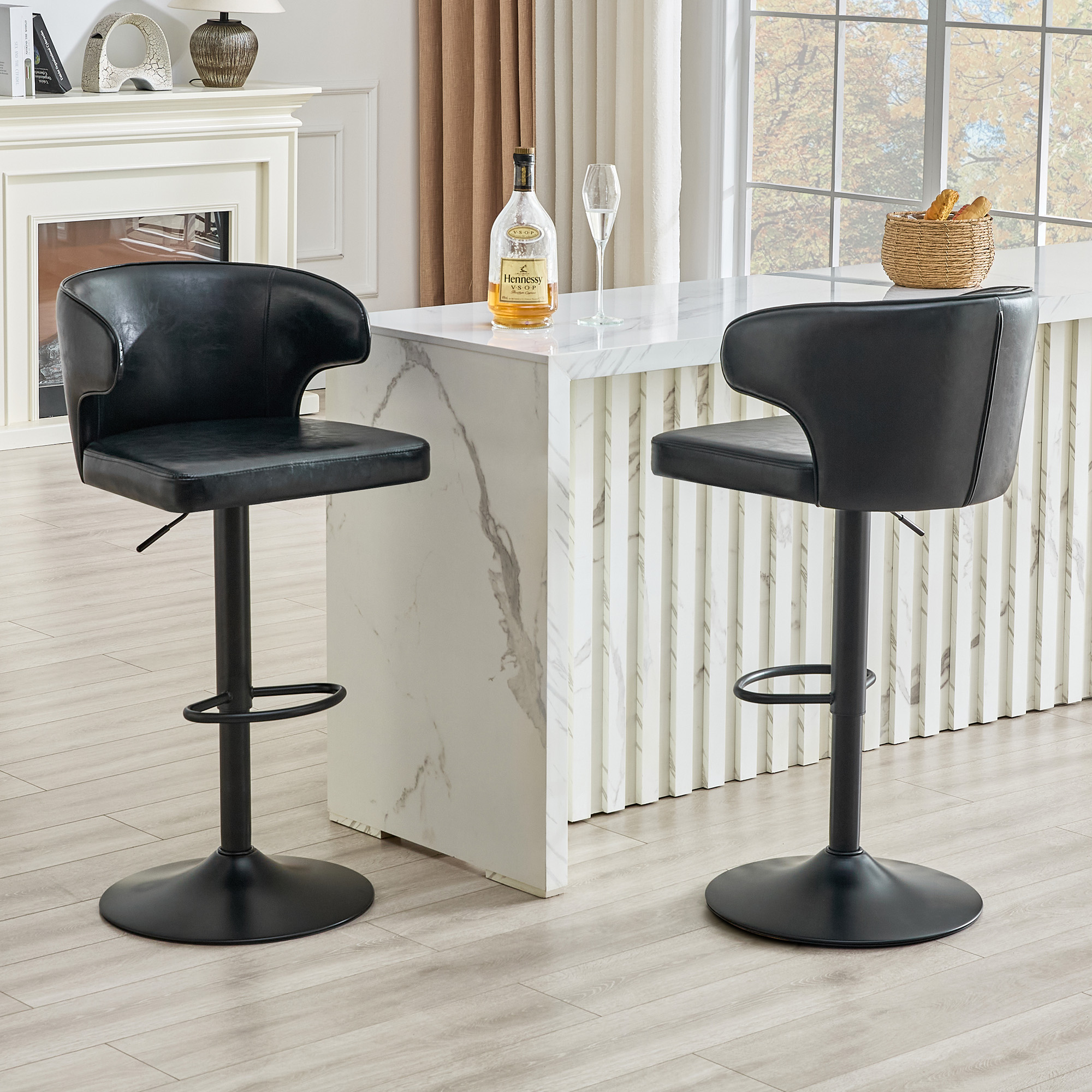 Modern Rotating Adjustable Bar Chair, Oil Wax Belt Backrest Swivel Chair, Suitable For Kitchen Bar Counter And Dining Room, Adjustable Height, Capable Of Bearing 300 Pounds Black -2 Pieces