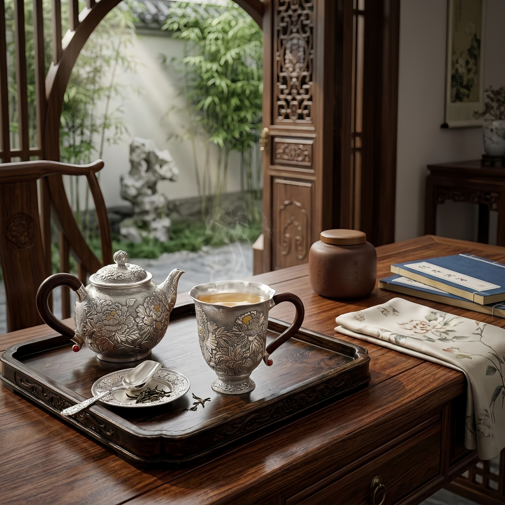 925 Sterling Silver Handcrafted Silver Peony Floral Mug with Elegant Wooden Handle and Red Gemstone Accent - Handicraft